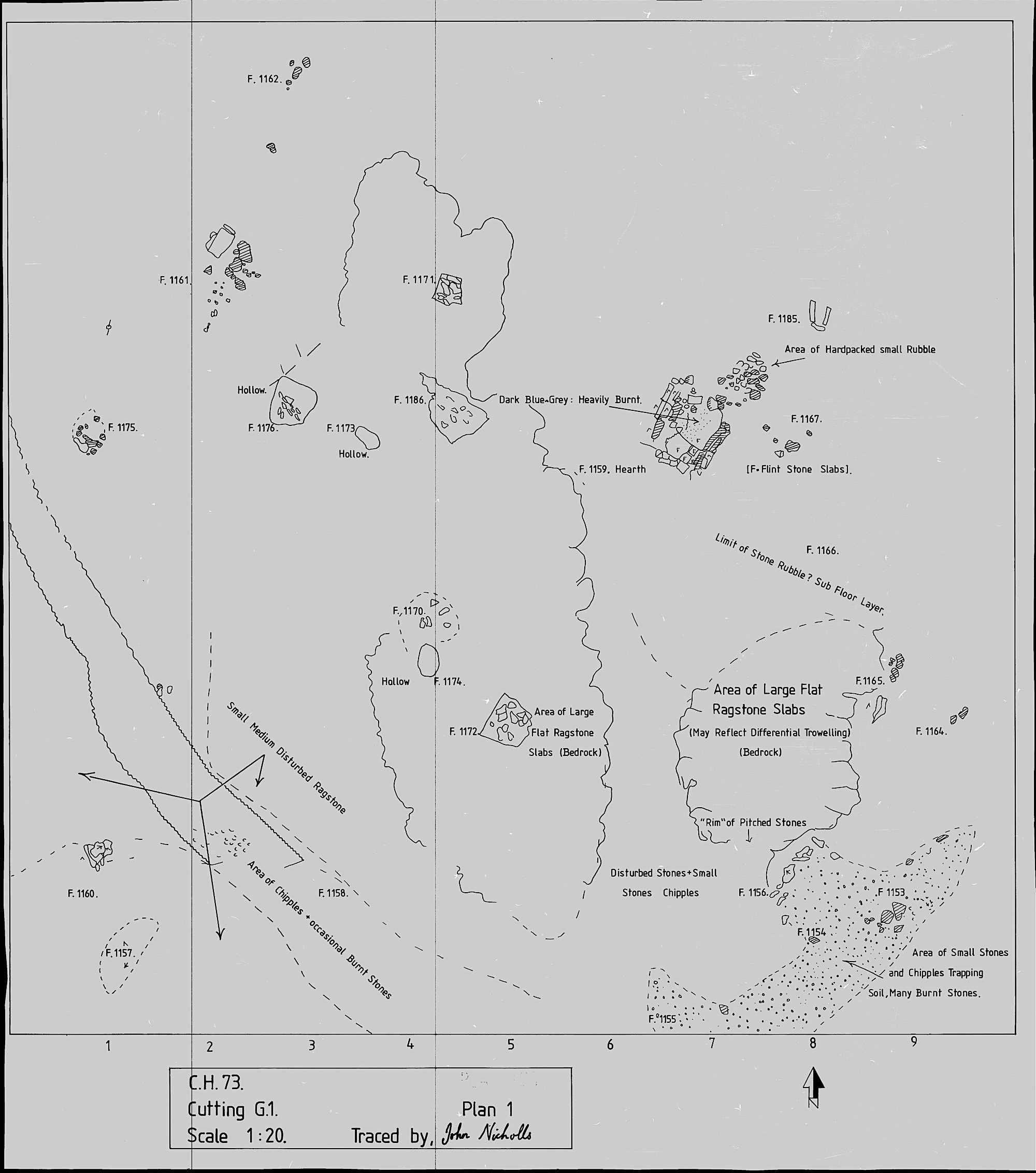 The many features in this square and those to the N and E seem certain to represent a structure, but defining it is tricky. The big hearth F01159 must be inside a building. Around it are a packed floor F01166 and vertical burnt stones in the SE of the square. F01161 to the NW may be another hearth.