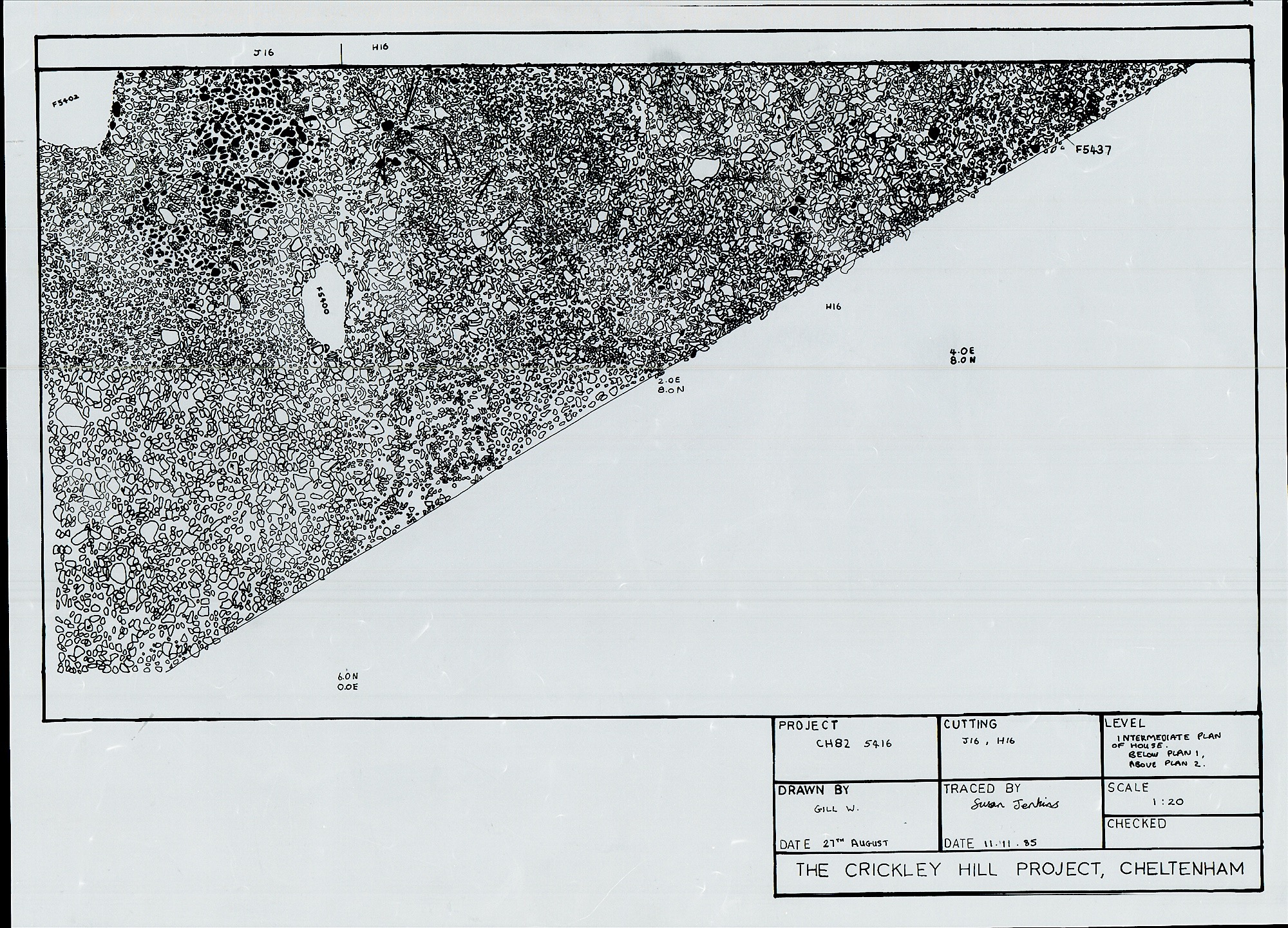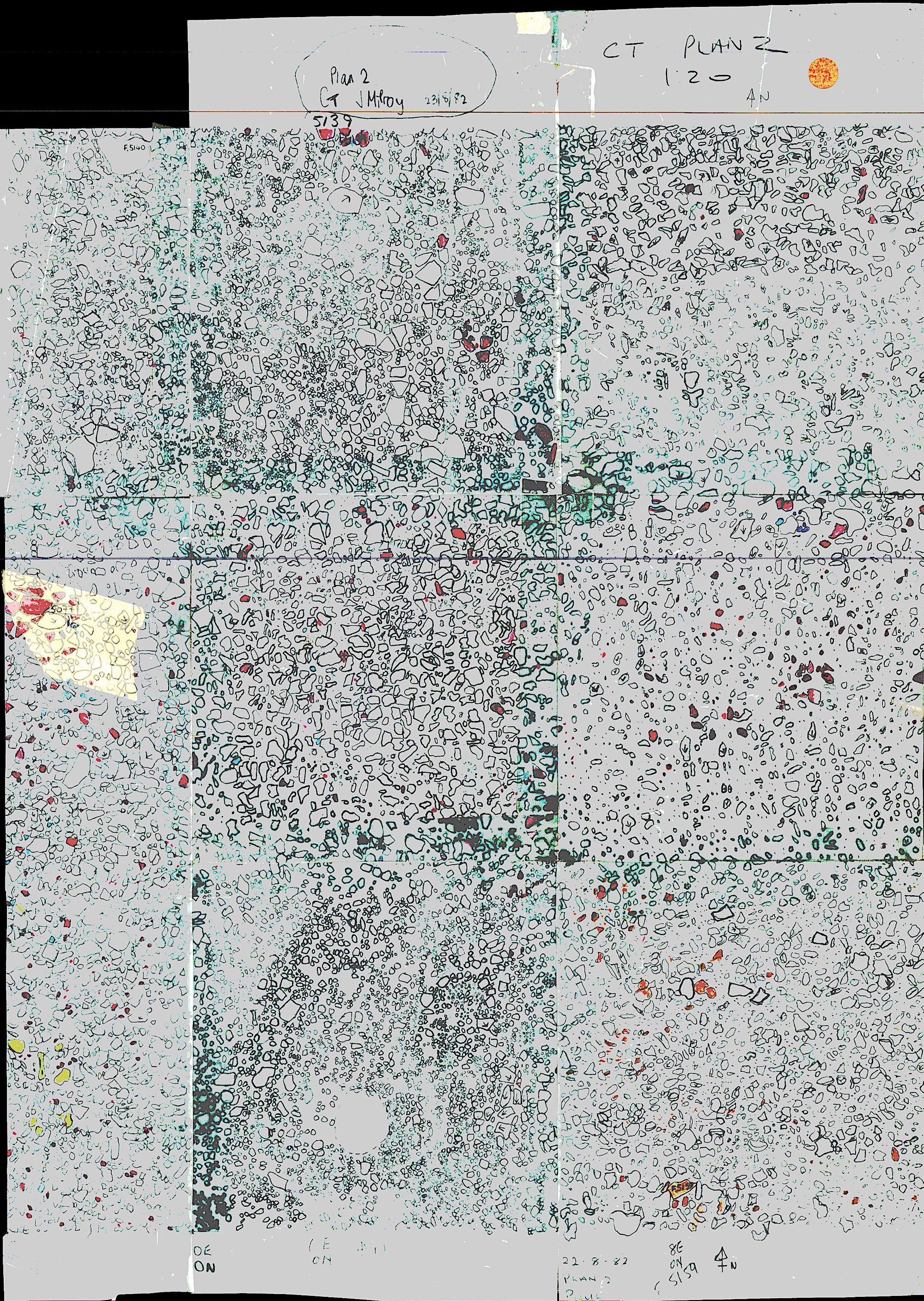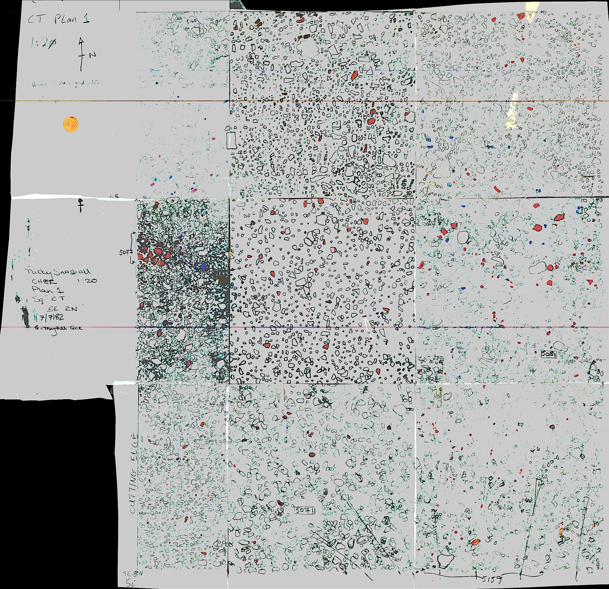 This square was excavated in CH82 (on the skewed grid that year as CT, 5mx5m), and the NW portion on the main grid. The NE portion was dug in CH86.