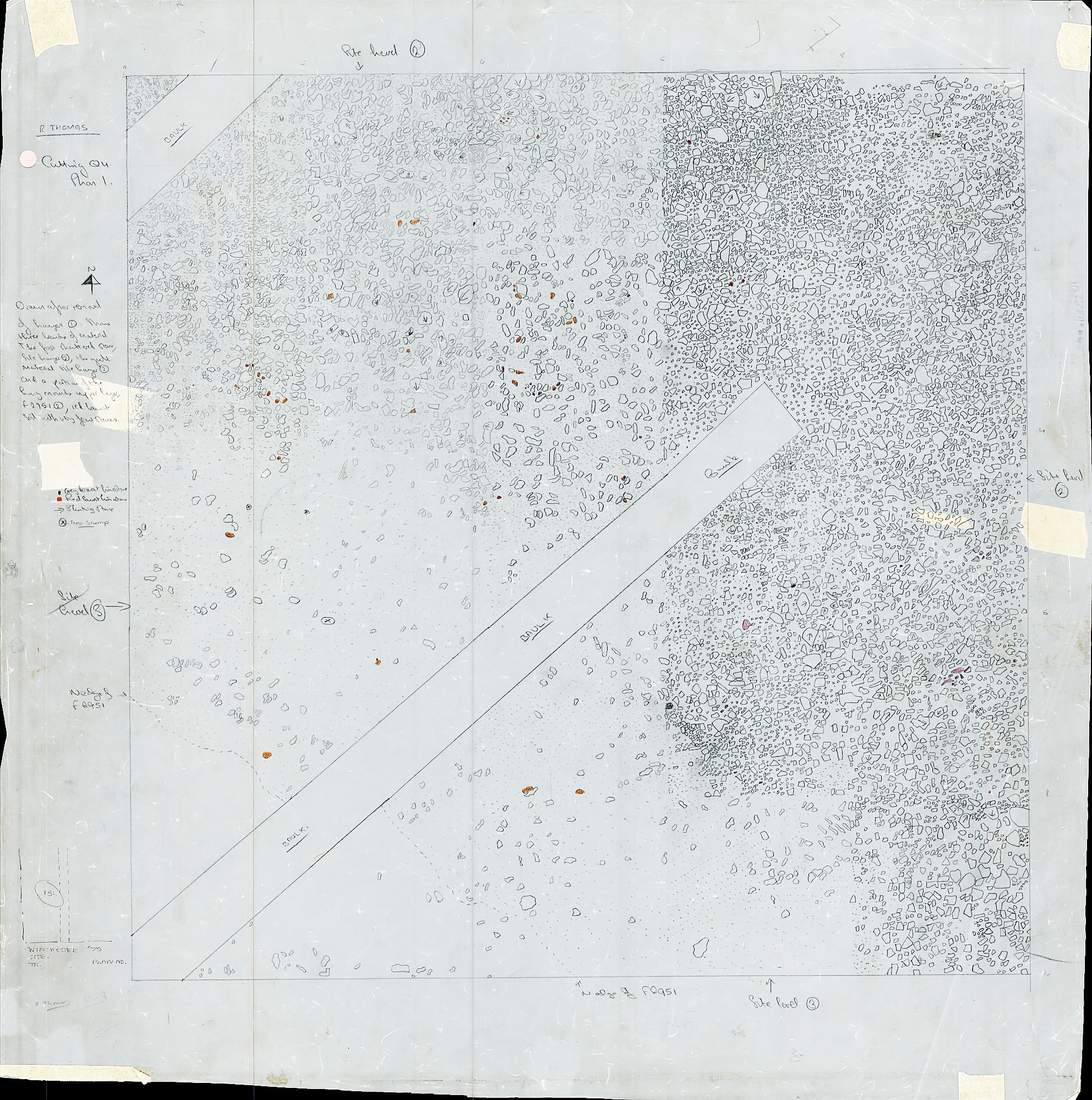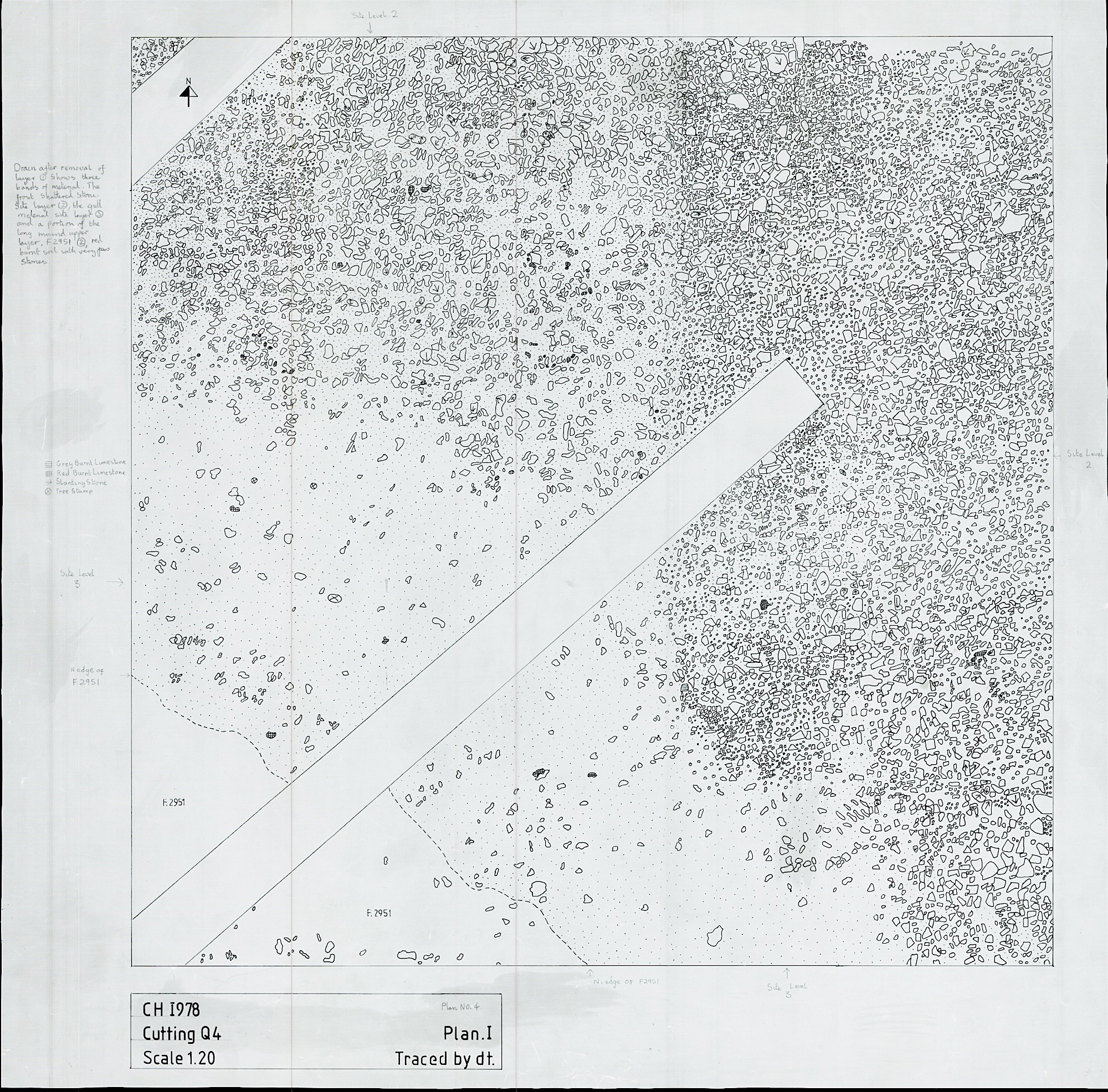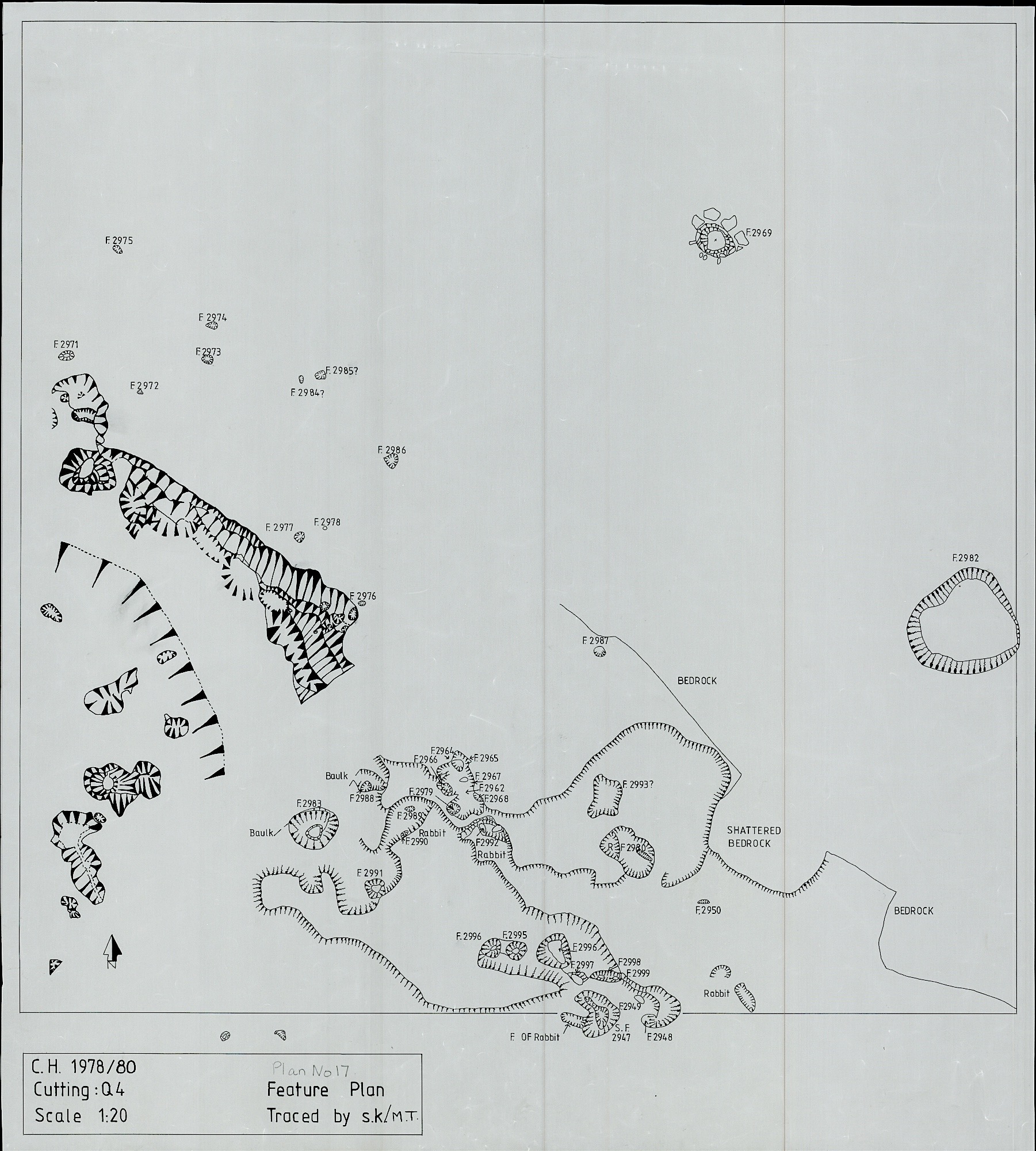 This cutting represents a clear transition both topographically and archaeologically. It runs down the slope into the Long Mound valley, and the SE part of the square laps onto the mound itself. In the NW, traces of the bank of the Continuous ditch enclosure occur, although the main bulk of this bank is further to the NW.