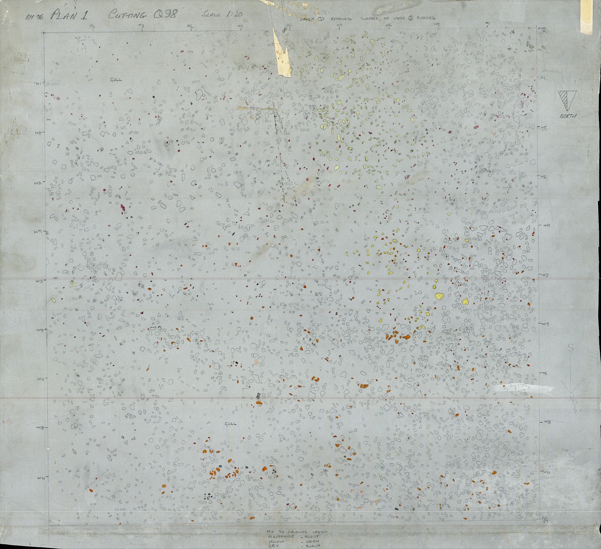 Looking NW across the pattern of grooves and gullies in this area of the CH76 cuttings, showing the position of Q98.