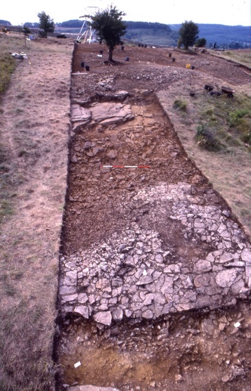 Following the discovery of the Sacred Circle in 1983, work continued on that area, and was extended to look at the steep slope to the North. It was hoped to pick up the line of the Neolithic defences. Sure enough, the long transect in CH84 (far left) found the ditch lines down the hill. Furthermore, there looked like an entrance passage way coming up the hill in W93 (below left). We extended and dug some more in 1985 and revealed the full Northern entrance to the Neolithic continuous ditch enclosure (left, looking up the entrance passage way), defended by a natural knoll with ramparts added.