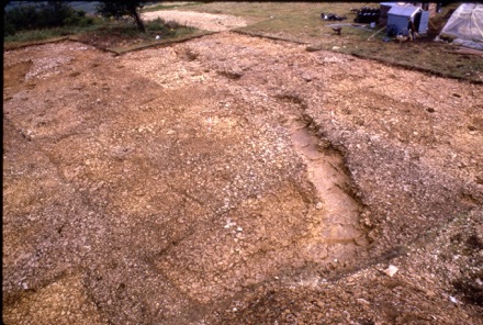 At about 3,700BC, about four acres at the highest point of the the hill was surrounded by a double ring of banks and ditches. This wasn’t really a fortified settlement - the ditches have gaps between, the bank was only about half a metre high with a palisade on top. This type of site is called a Causewayed Enclosure, and Crickley is one of many across Southern England (they are in the Low Countries too). There were several entrances - about five - with apparently the main one on the South East side. A roadway leads from this approximately along the line of the modern fence, and round to the right onto the top of the hill.