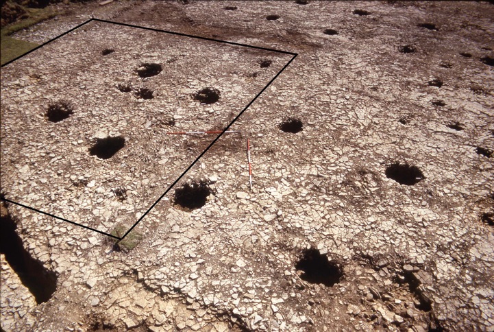 The view SE of the CH72 cuttings towards the hillfort entrance with the postholes of Structure A1 in the foreground.