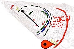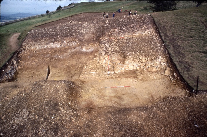 The big rampart cutting at the southern end of the surviving Iron Age defences. In 1982 we cut a slot right through the rampart. The refurbishment and strengthening of the wall and ditch which marked the building of the later hillfort peters out at this point, showing it was unfinished.