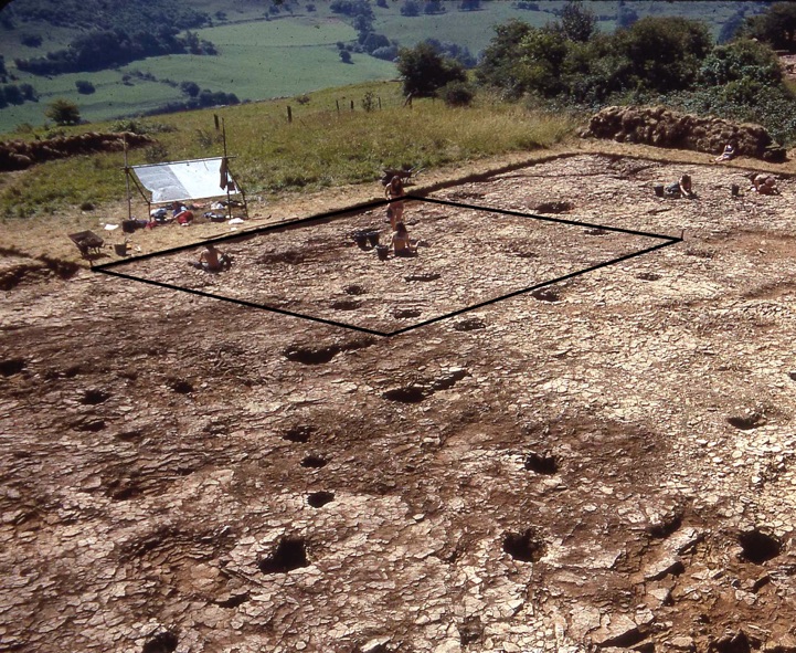 Posts from one of the earlier Iron Age longhouses (Structure A2) can be seen in the North of this cutting. In the SW of the square are the remains of a well-preserved stone-lined hearth and posthole cluster which are interpreted as a round house of the later hillfort phase, Structure B4.