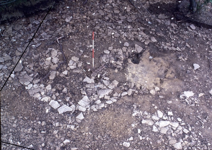 This is the site of perhaps the best preserved post-hillfort structure on the site. Nestling right up to the rampart and close to the ad hoc entrance way of the period, the slabs of the wall foundations can be clearly seen, along with a central hearth. Underneath all this, the four post Structure C15 was found.