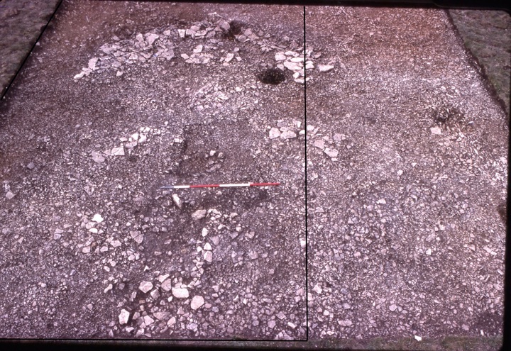 The CH83 reopening of H17/J17 showing the well-preserved remains of a complete post-hillfort house. J17 is the left hand 6m section of this cutting.
