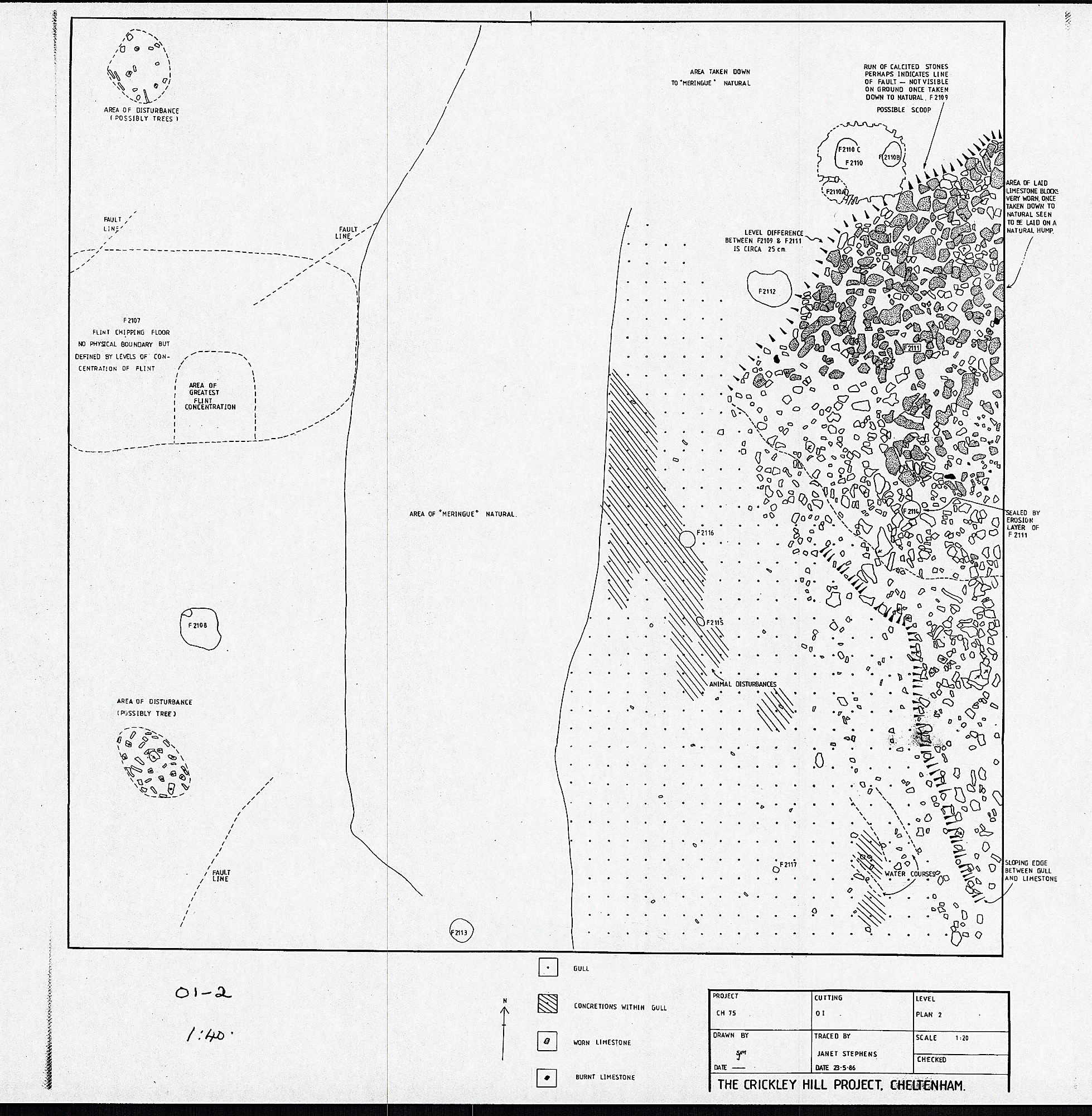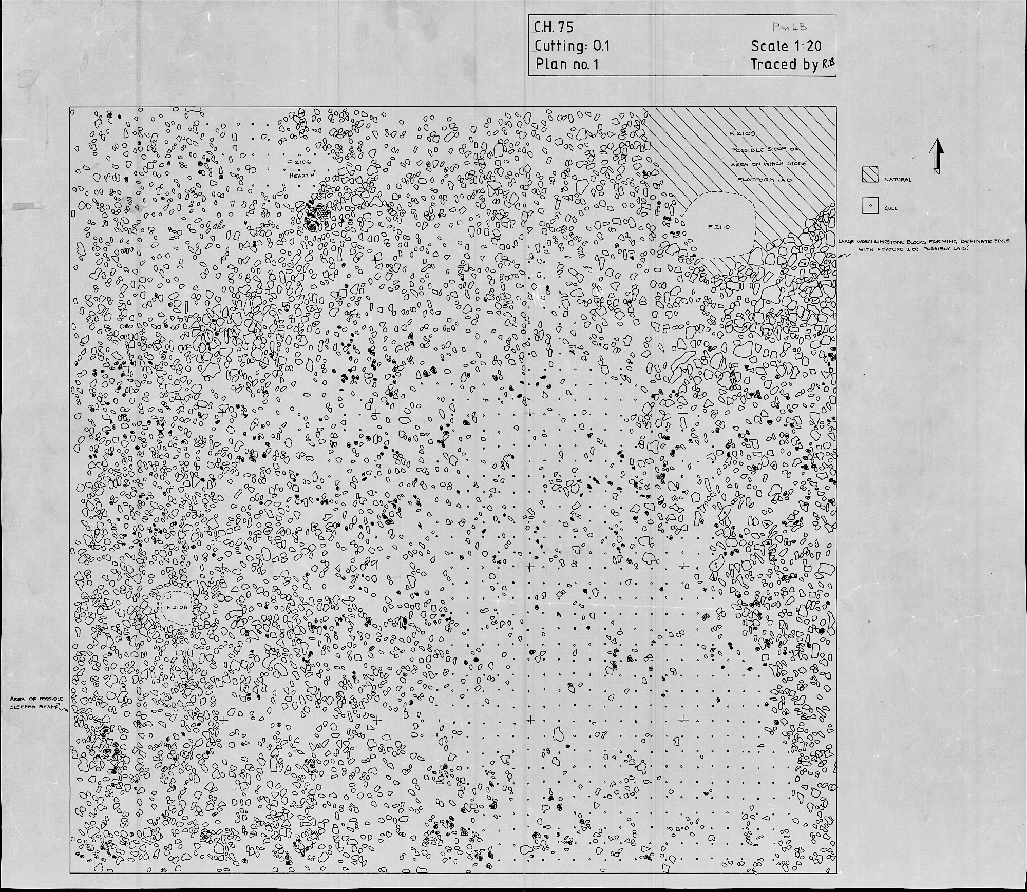 This cutting is in the flat area in the middle of the Neolithic settlement on the top of the hill. Despite little sign of structures apart from a few scattered postholes, this was the site of a major flint knapping floor F02107, where about 10,000 flint flakes were found. Amongst them were arrowheads in various stages.