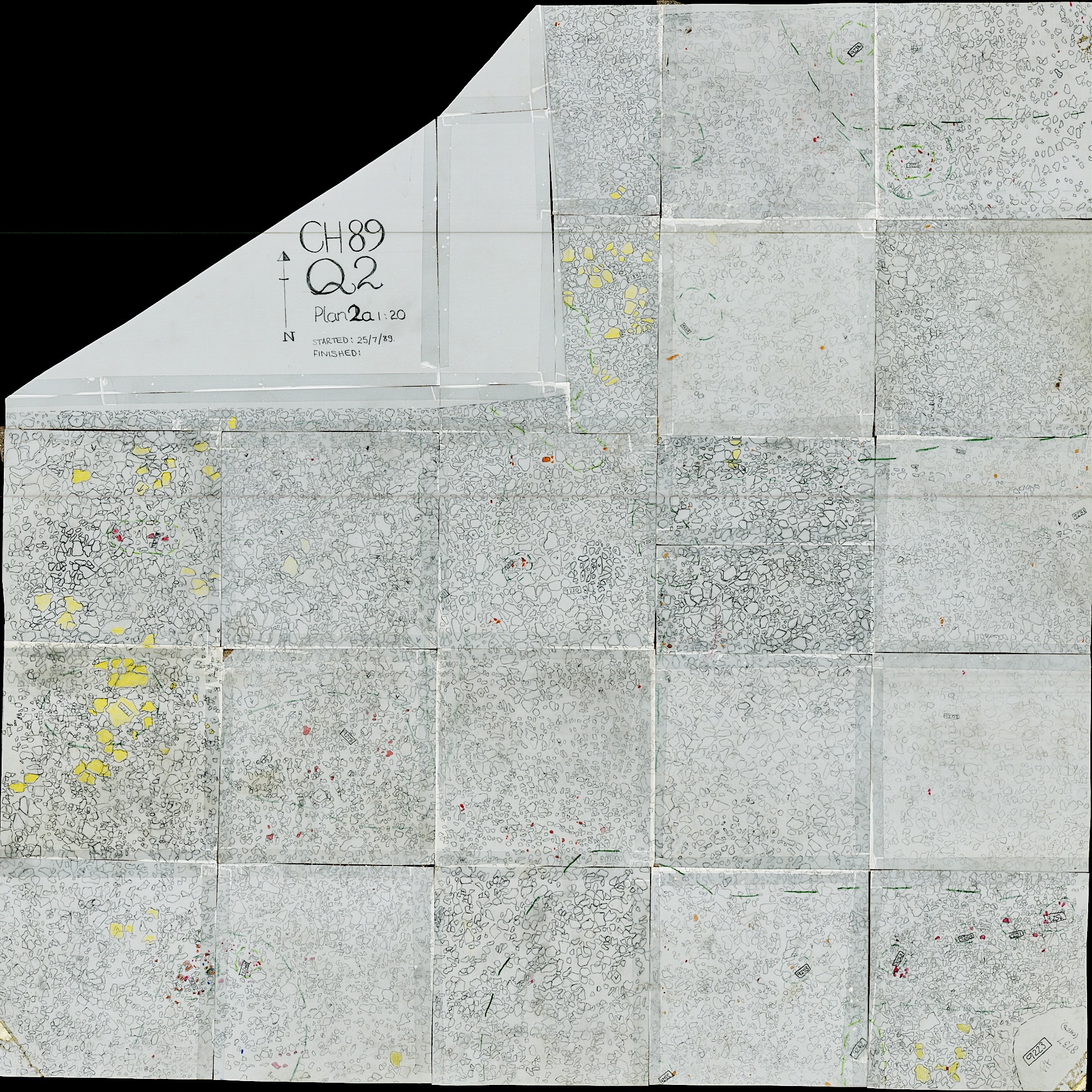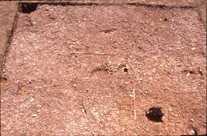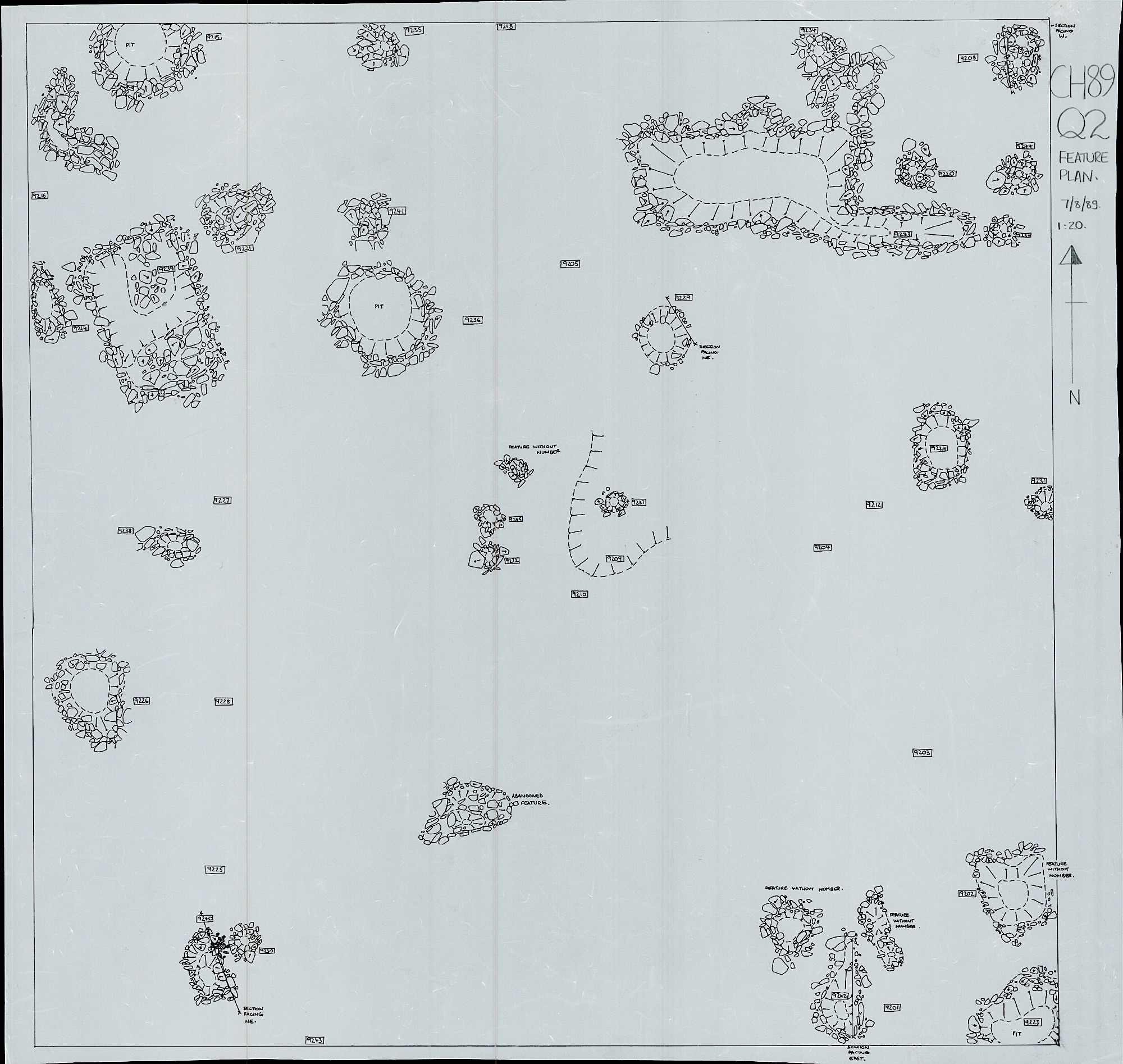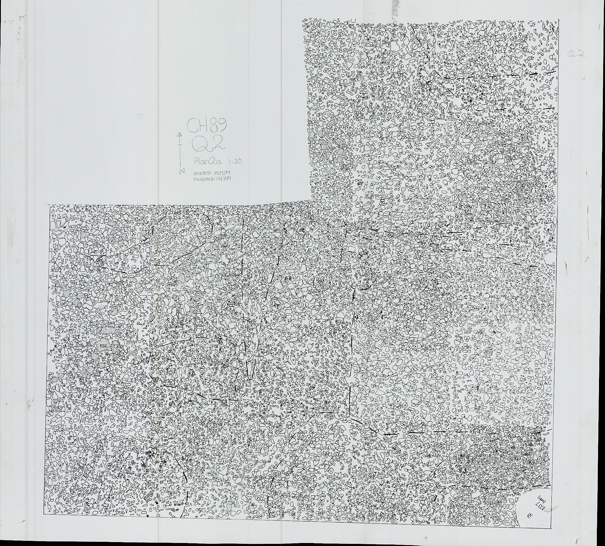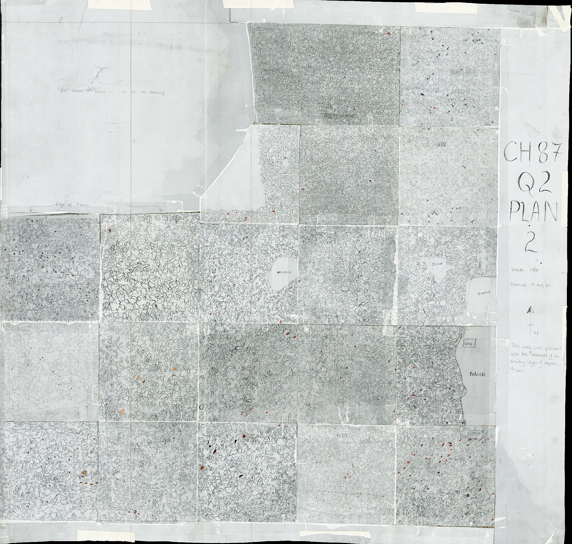 This cutting is at the top of the slope into the Long Mound valley, as the gradient begins to increase. The trackway leading up from the Long Mound valley to the central Neolithic area first found in R2 continues in this square, but it is very difficult to pick this up in the photos or plans.