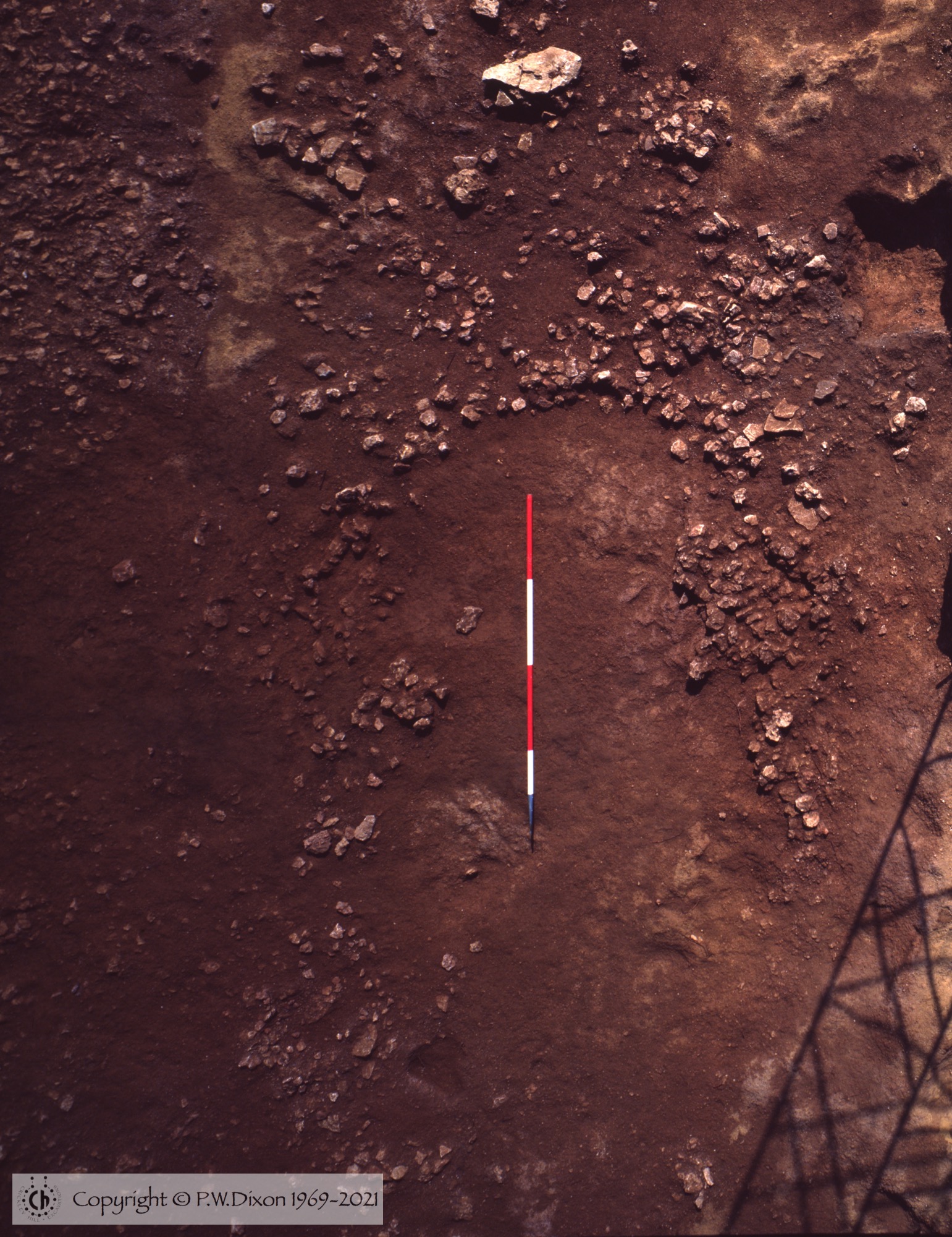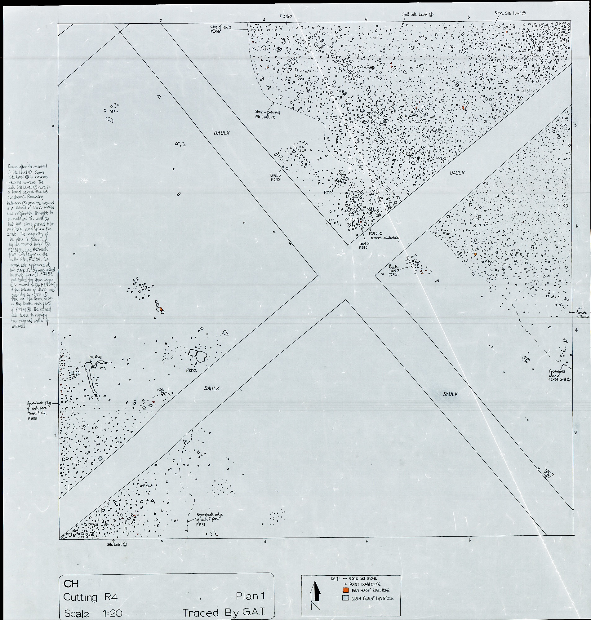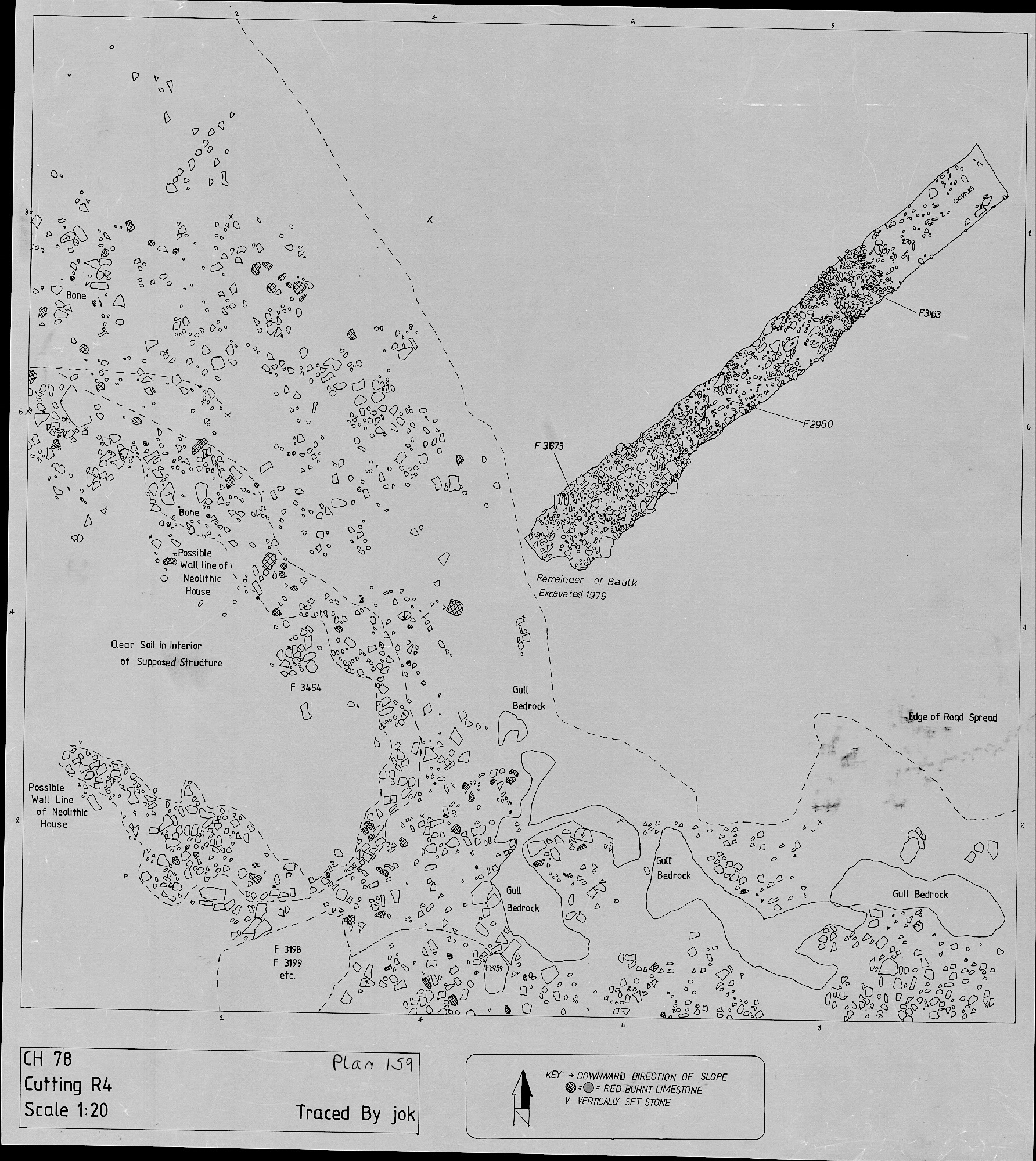 This cutting was right on the centre line of the Long Mound, revealing the by now expected Sacred Slabs on either side. Perhaps more important, however, were the Neolithic layers sealed underneath it. A possible house outline was preserved in the shadow left in the scatter of stones in the lower layers.