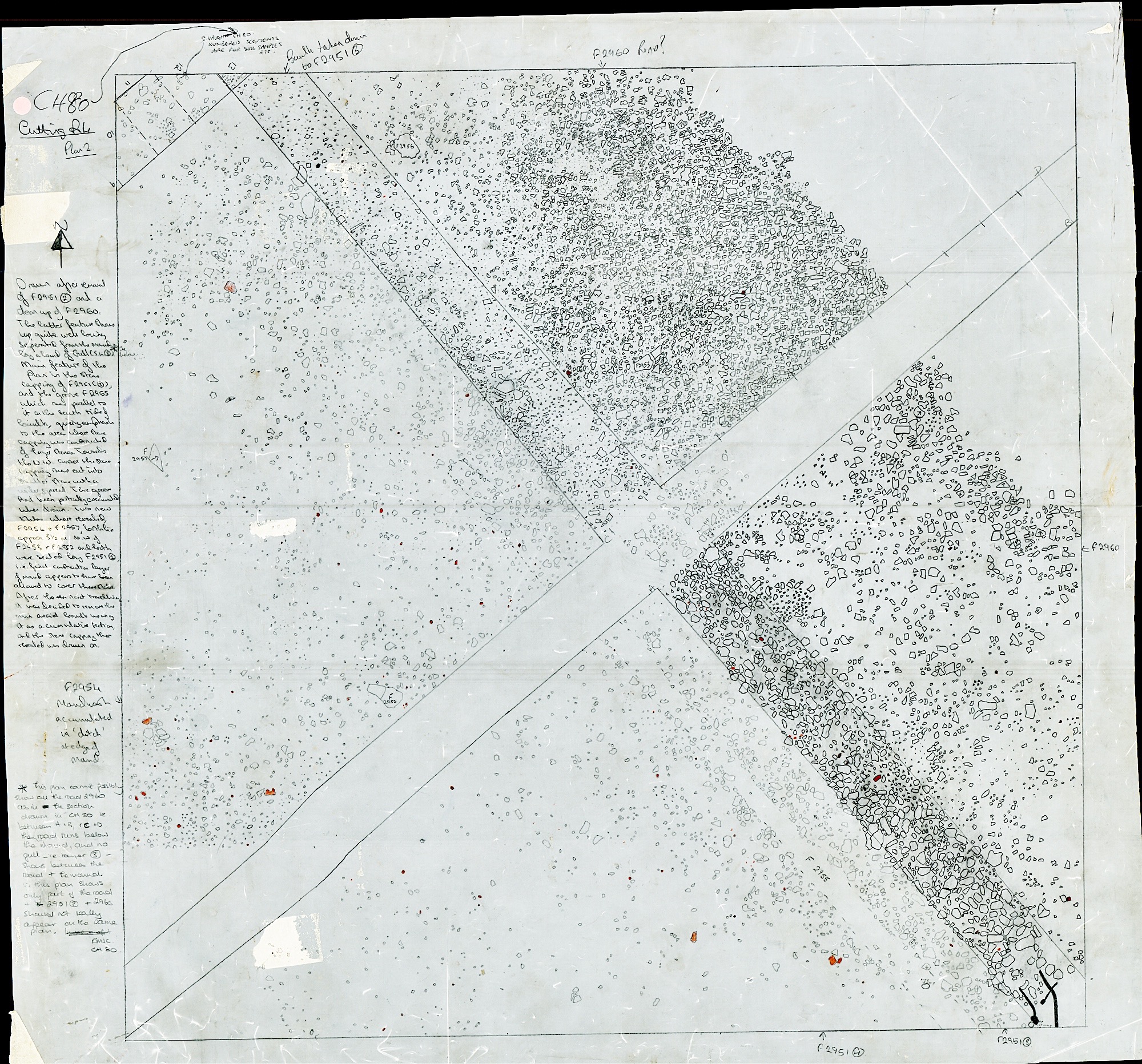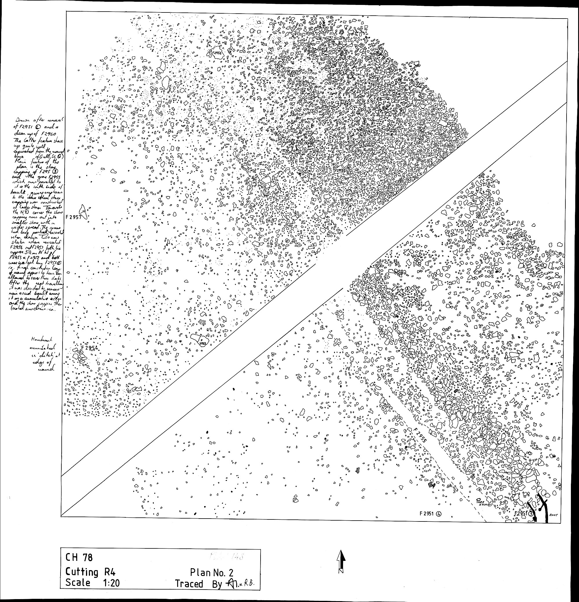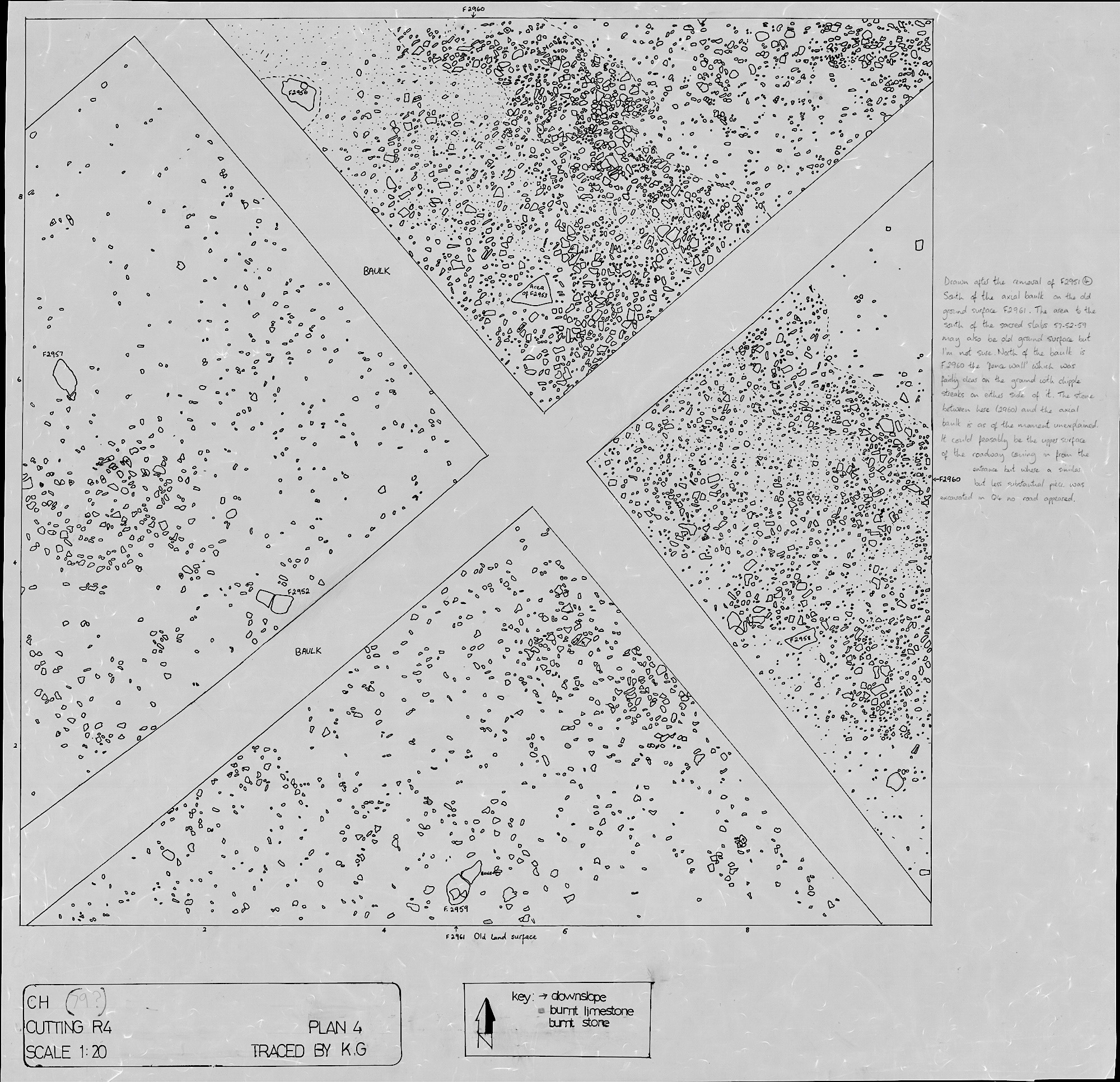This cutting was right on the centre line of the Long Mound, revealing the by now expected Sacred Slabs on either side. Perhaps more important, however, were the Neolithic layers sealed underneath it. A possible house outline was preserved in the shadow left in the scatter of stones in the lower layers.