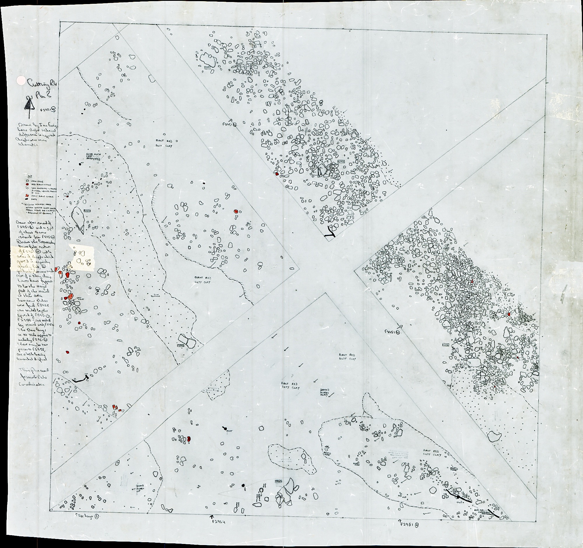 Looking SE at what is believed to be the shadow of a Neolithic house preserved by the stone scatter under the Long Mound. There is a sacred slab at the top of the picture, upstanding on an unexcavated pedestal.