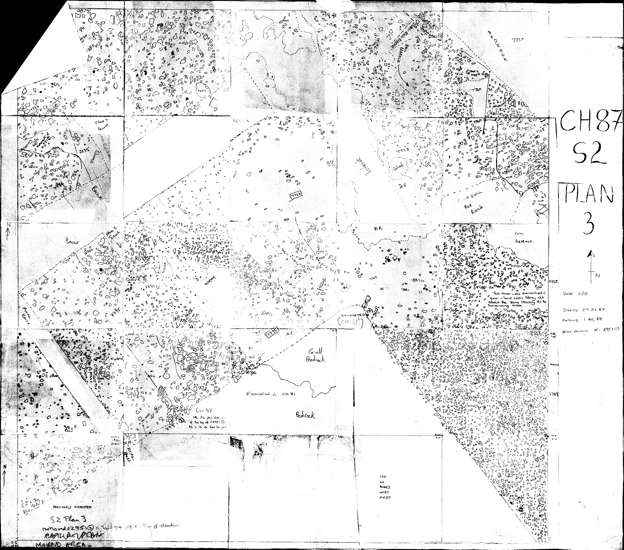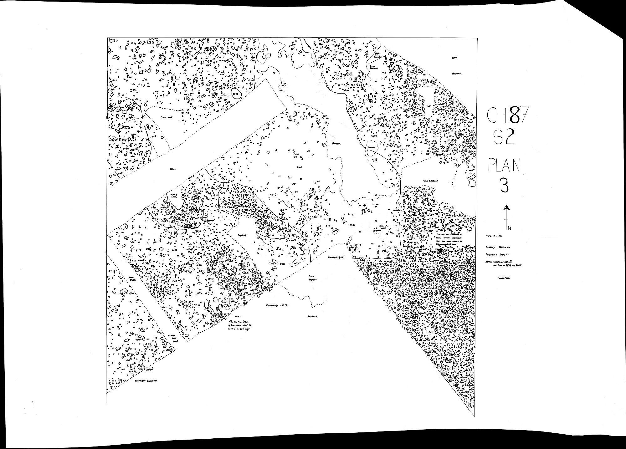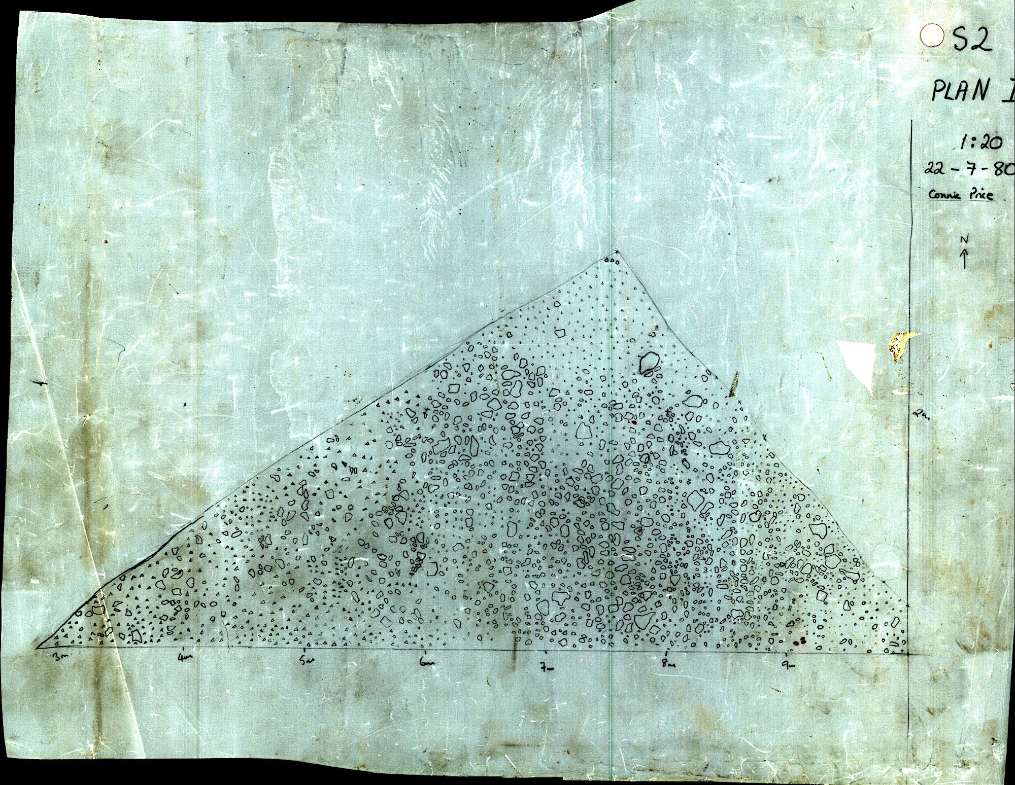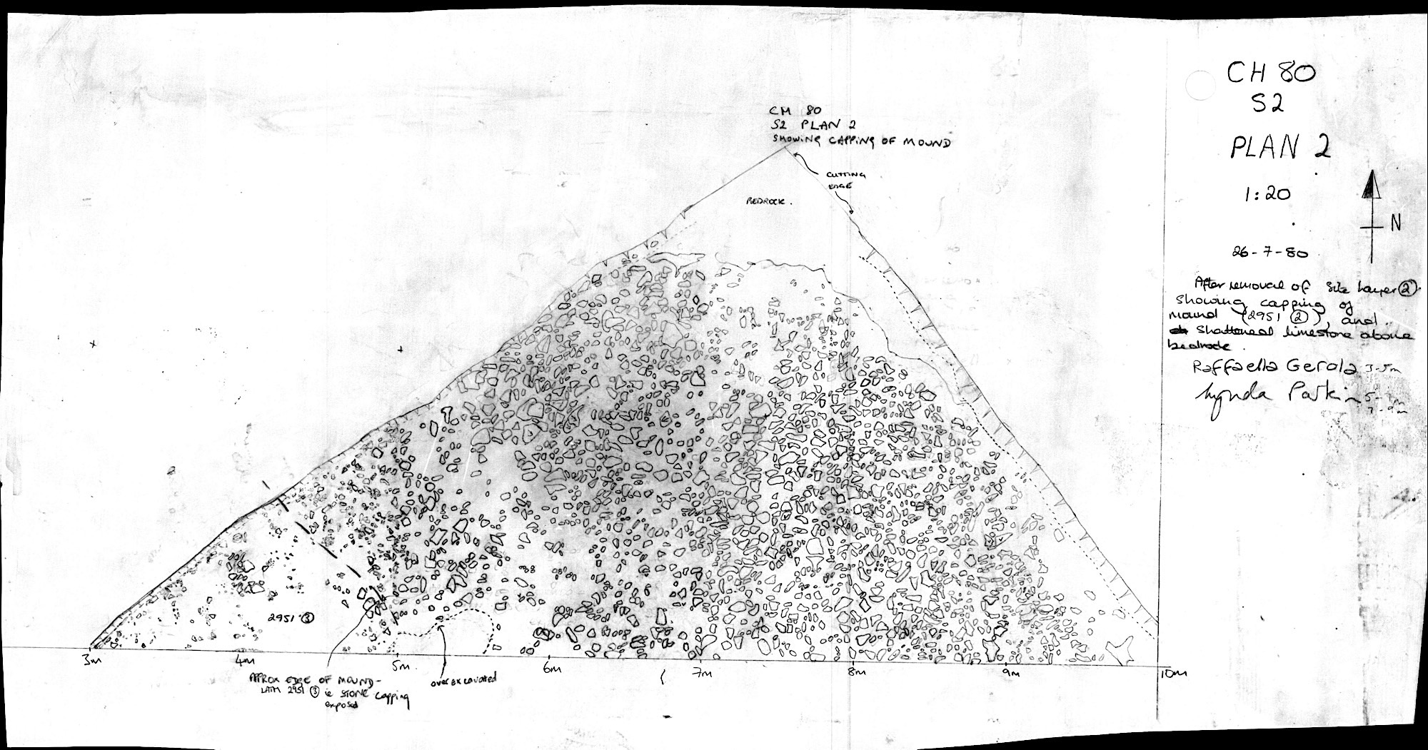 Much of this square was occupied by the Long Mound with its usual accompaniment of Sacred Slabs. However in this area it sealed some features which clearly pre-date it. Small cairns of stones of a regular structure appear to have been deliberately built in this area, later buried by the mound.