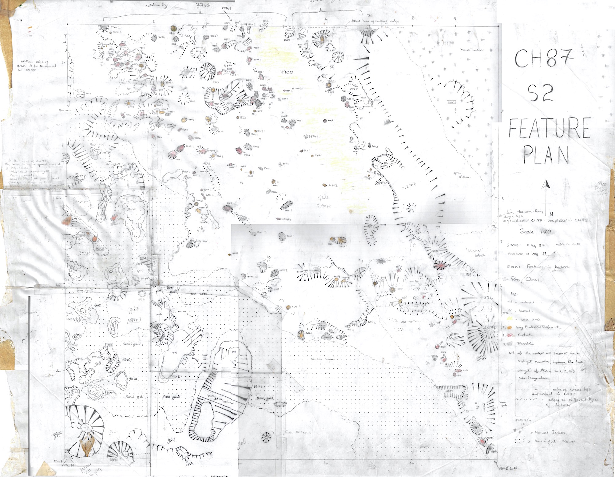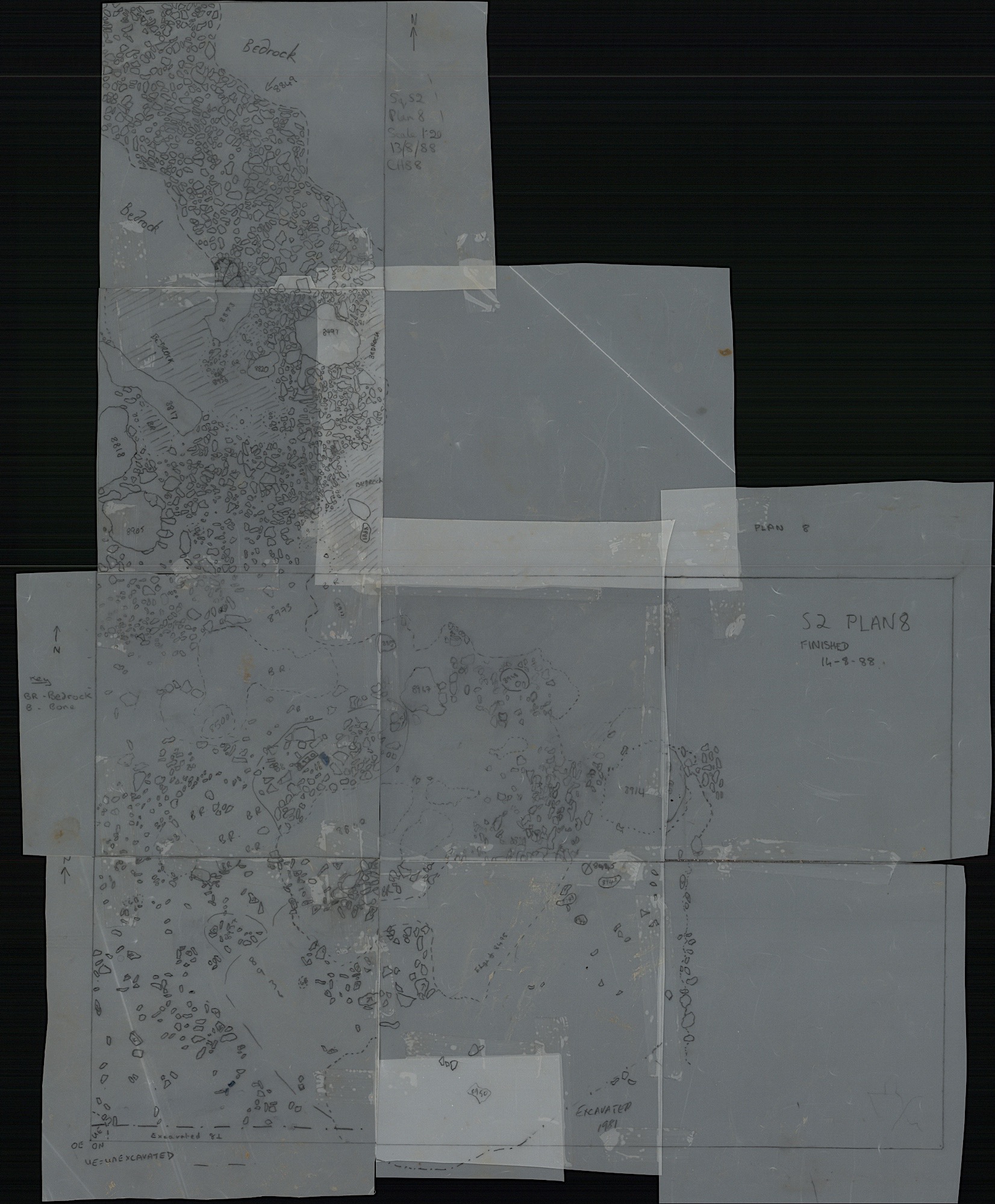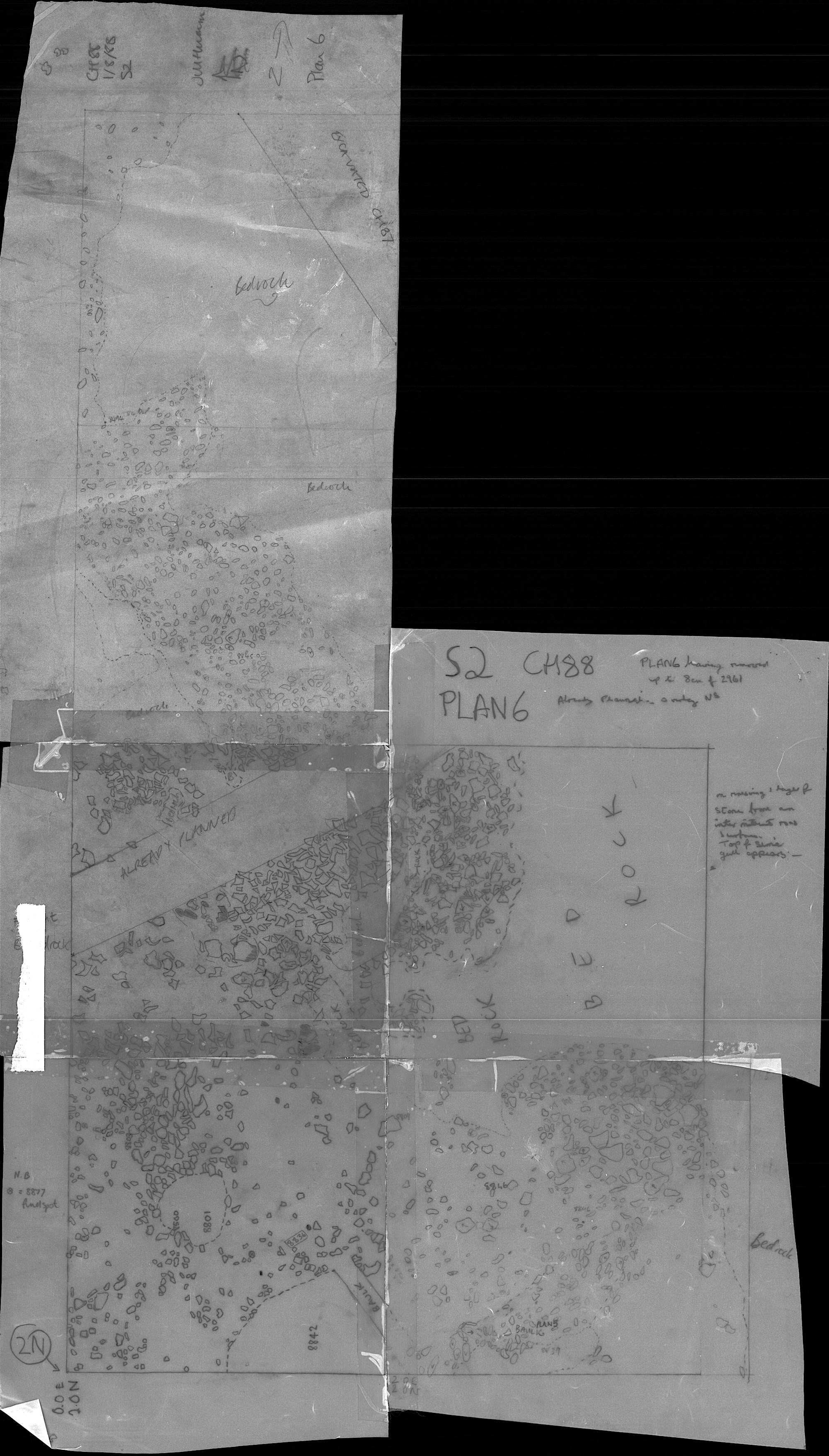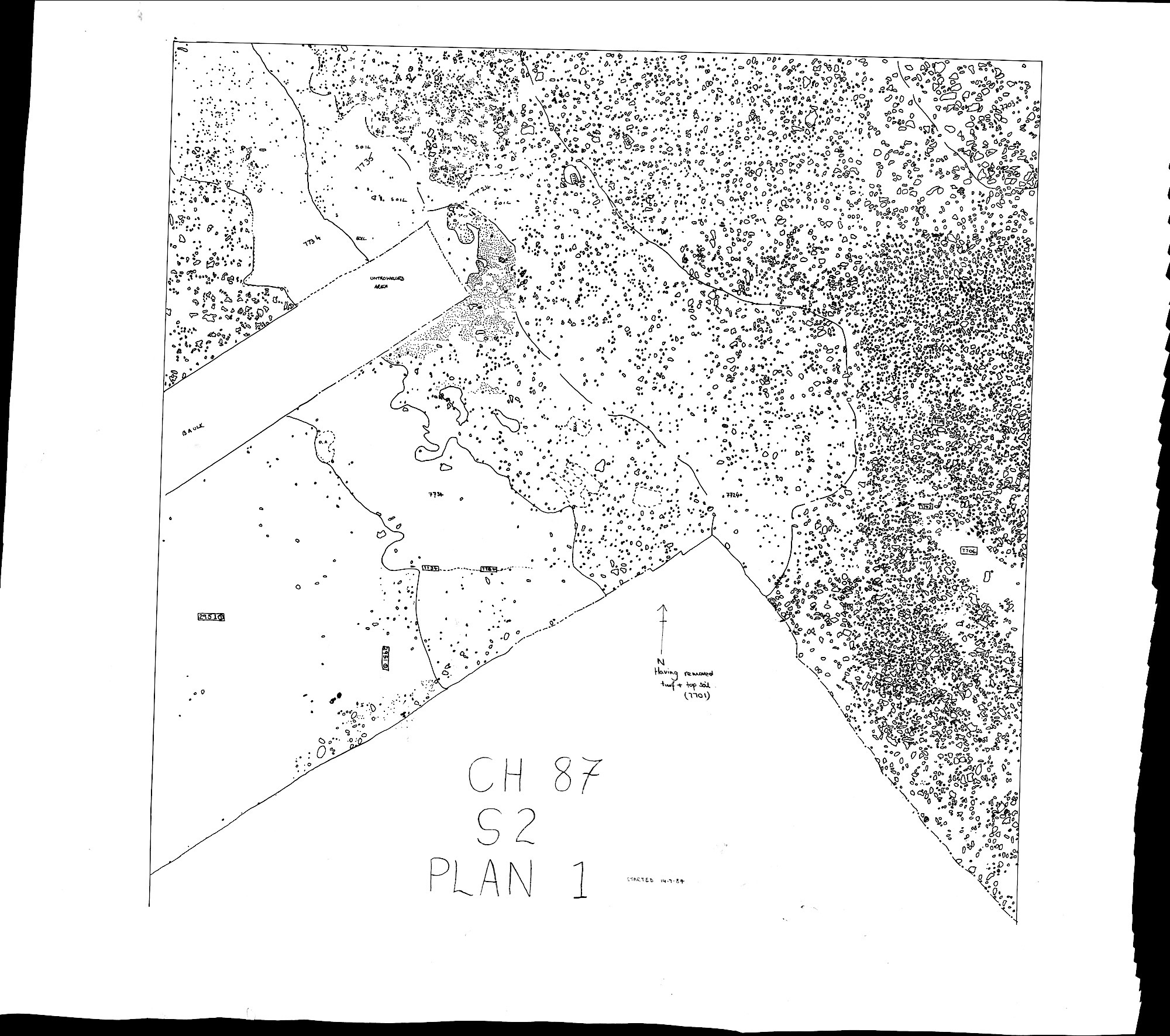 Much of this square was occupied by the Long Mound with its usual accompaniment of Sacred Slabs. However in this area it sealed some features which clearly pre-date it. Small cairns of stones of a regular structure appear to have been deliberately built in this area, later buried by the mound.