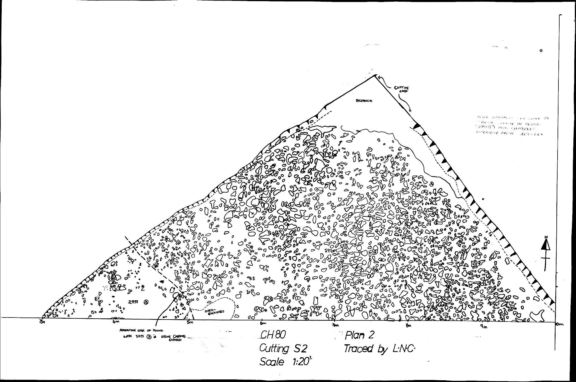 The view NW along the line of the Long Mound showing the CH87 cutting with some of the stone features under the Long Mound appearing.