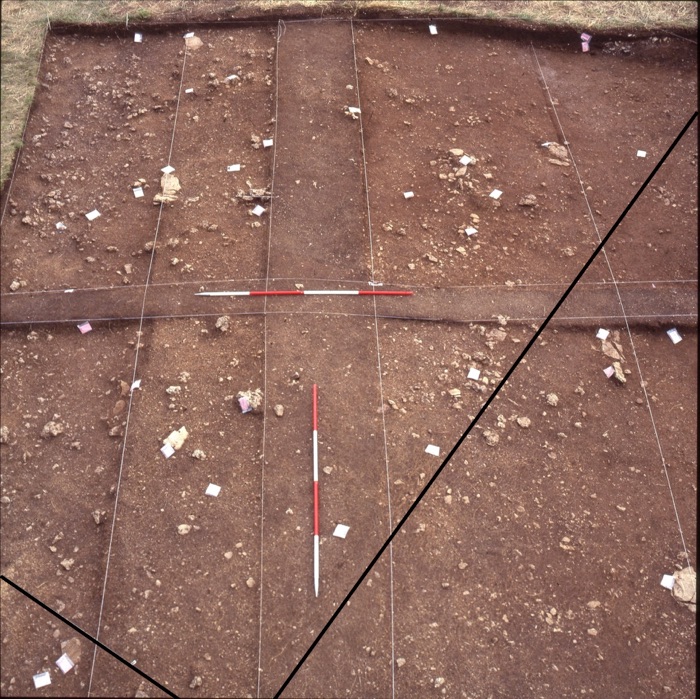 The last part of the Long Mound to be excavated. The CH93 cutting was split between T1 and U1. It revealed more about the phases of the various monuments on the site, representing the end of the second phase of the Cairn. The second phase of the Long Mound appears to end just beyond the baulk in the photo.