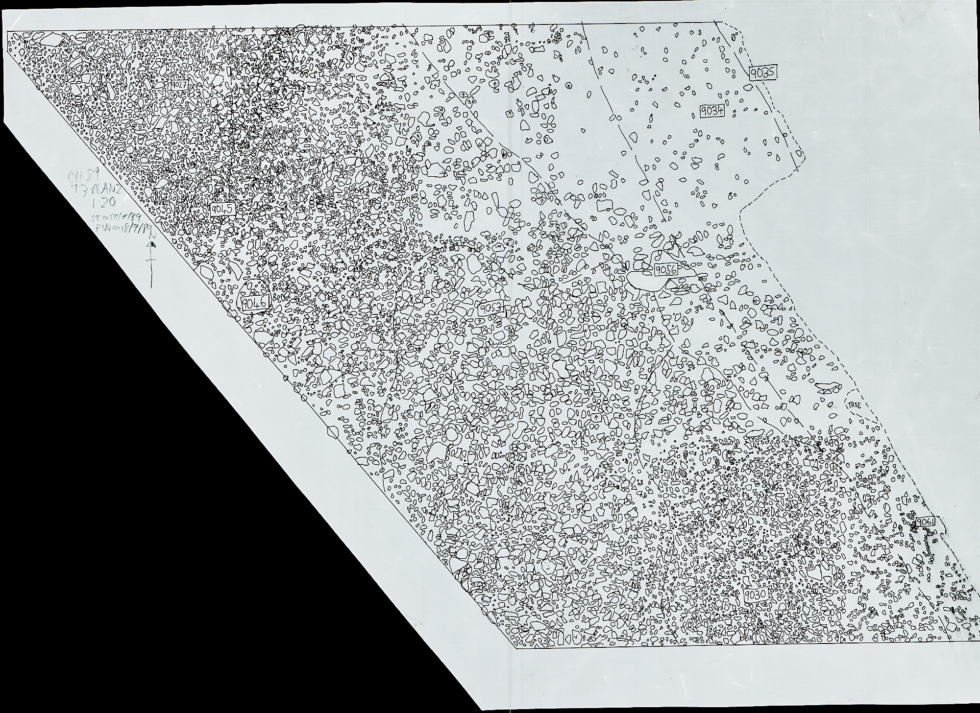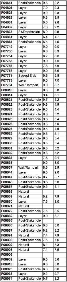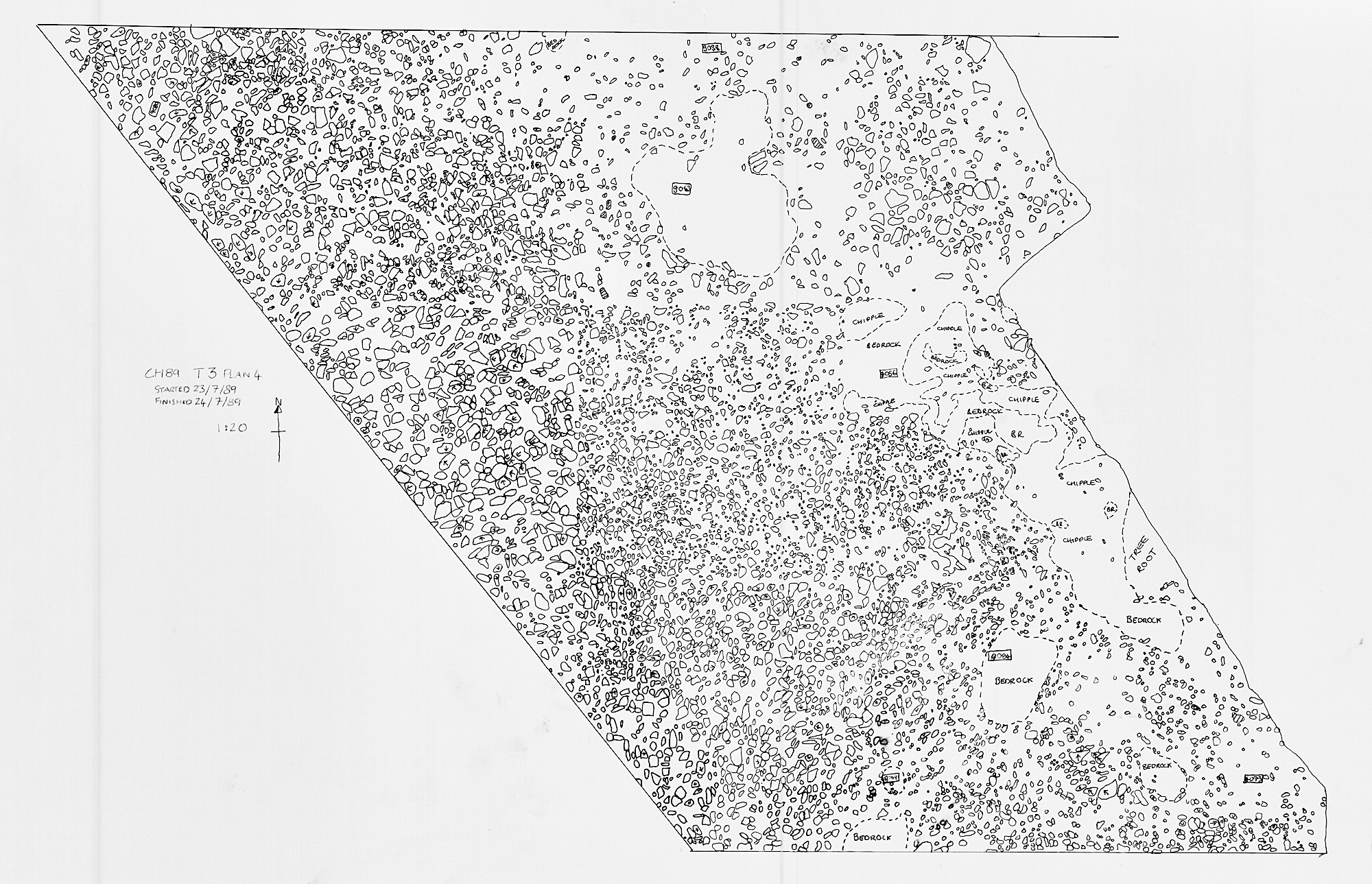 This square occupies the slope to the West of the Long Mound. Parts of it made up odd corners of excavation areas in CH81 and then in CH87-88 and again in CH89. Numerous features because the gull beneath the Mound preserves small features well.