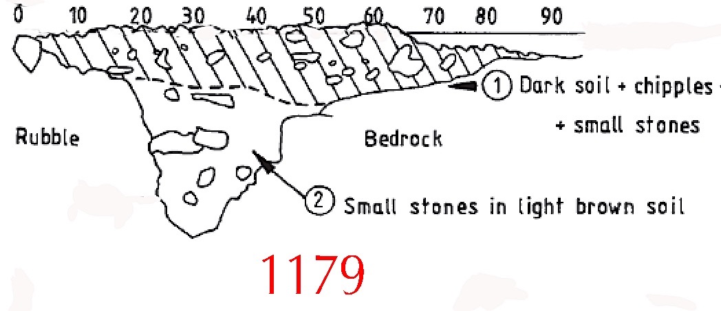 | F01179 | G99 | Joint containing yellow stones. A belt of yellow stones, possible iron-stained, was sectioned near its south west end in G99 revealing the two layer infill shown. The top fill, in layer (1) yielded flints, but layer (2) was sterile. The north west side of this apparent trough was a clear cut bedrock shelf: the south east side could not be located accurately, for the layer (2) fill was indistinguishable from the rubble of the stony platform, through which the trough is presumed to have been cut. The vertical bedrock edge on the north west side might be a joint side. Two further sections to the north east indicated that the belt of the yellow stones had no depth and that the section drawn above simply happened to coincide with a joint. There was no size difference between the yellow stones and those of the stony platform (F01183), the yellow line crossed the north east limit of F01183 and was, therefore, later that it. | 1 | 3 | 80 cms | 33 cms | 1 | 1 | 1 | 1 | http://www. | http://www. | http://www | http://www | http://www | ||||||||||||||||||||||||||||||||||||||||||||||||||||||||||||||||||||||||||||||||||||||||||||||||||||||||||||||||||||||||||||||||||||||||||||||||||||||||||||||||||||||||||||||||||||||||||||||||||||||||||||||||||||||||||||||||||||||||||||||||