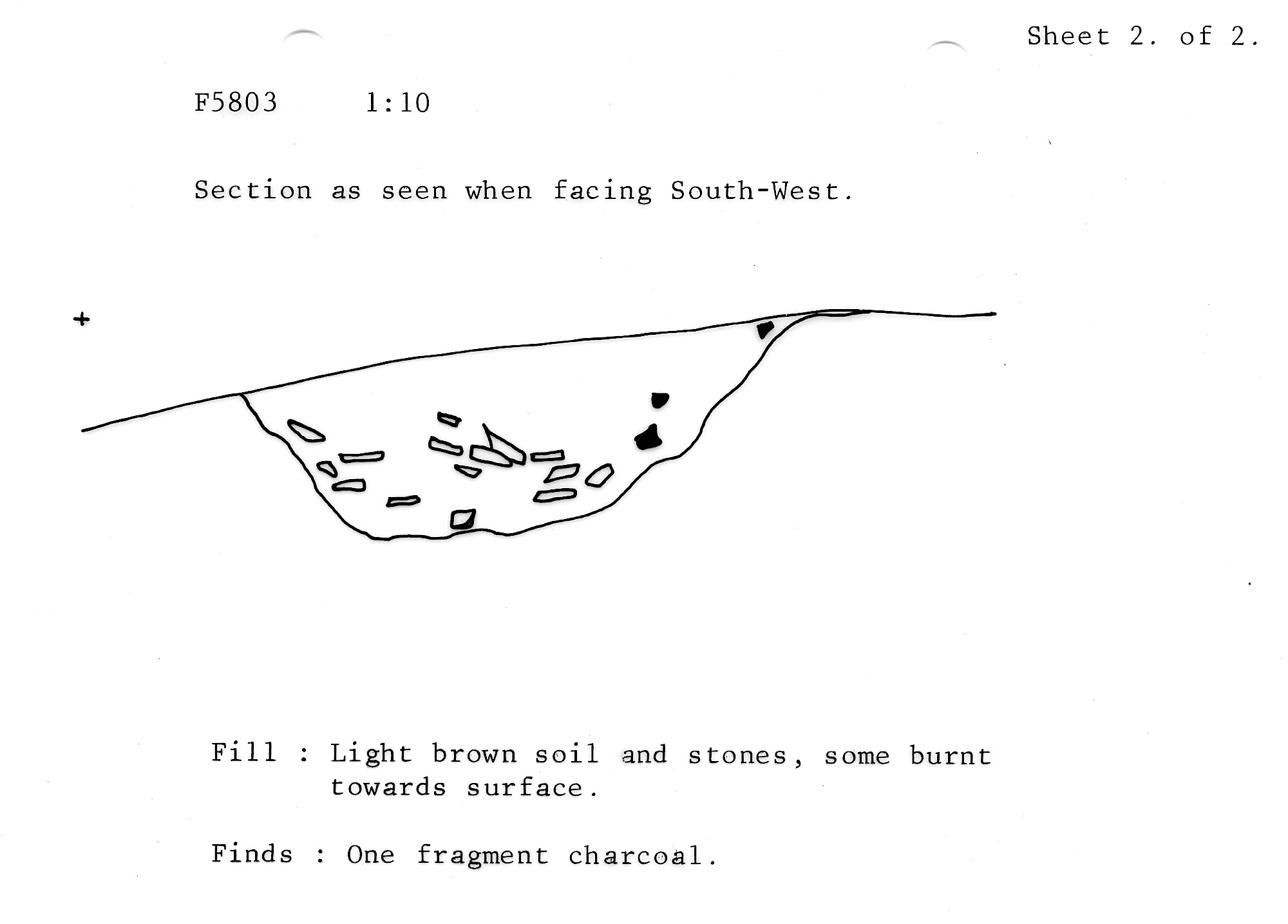 large burnt stones, quite steep sided. Maybe a small cut posthole |
