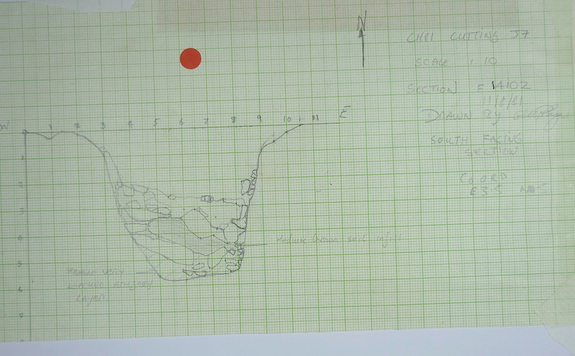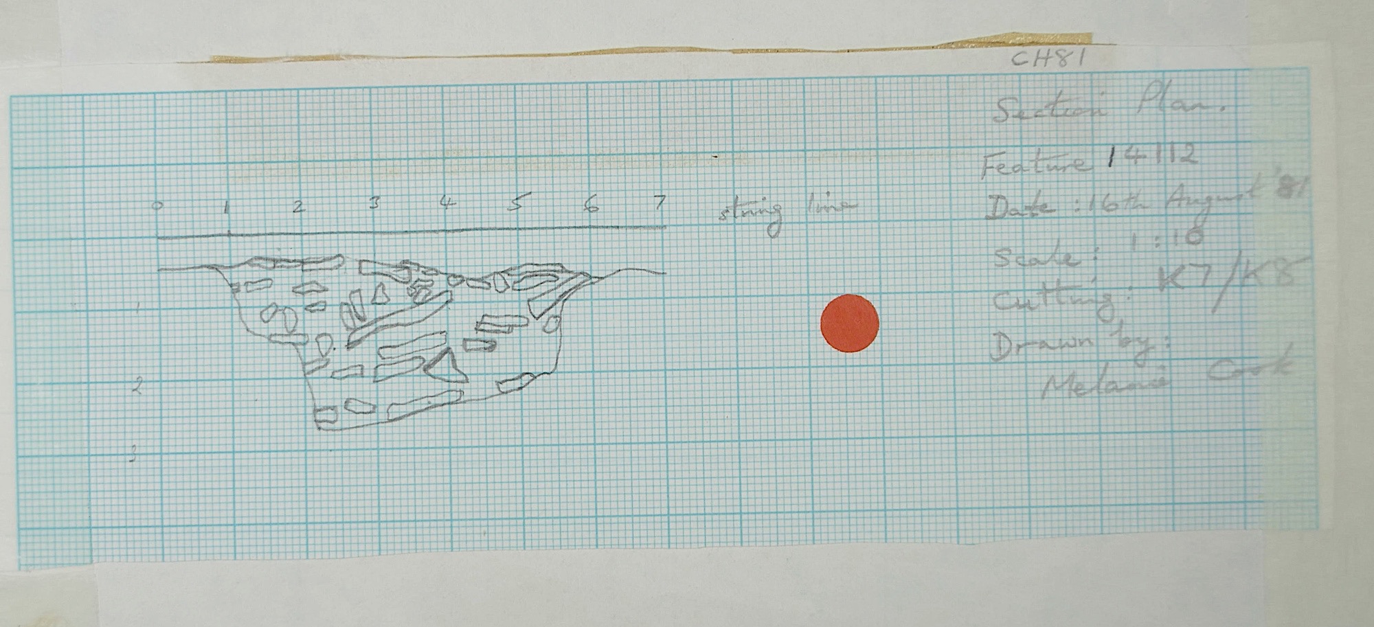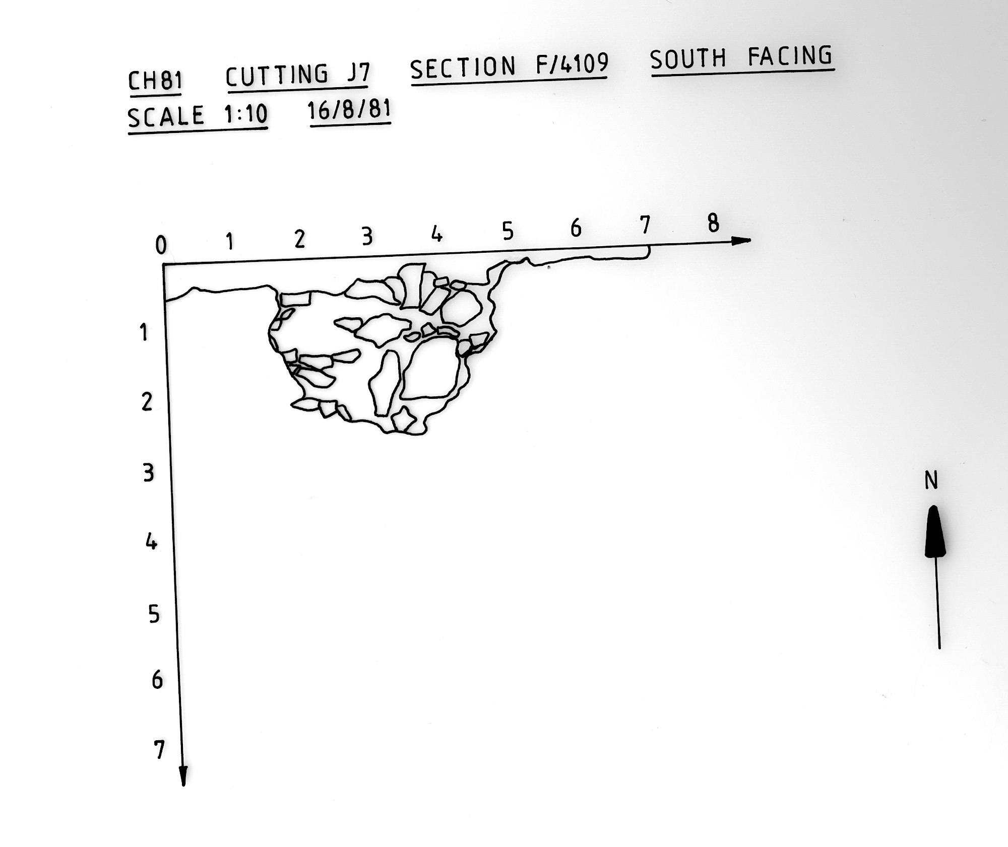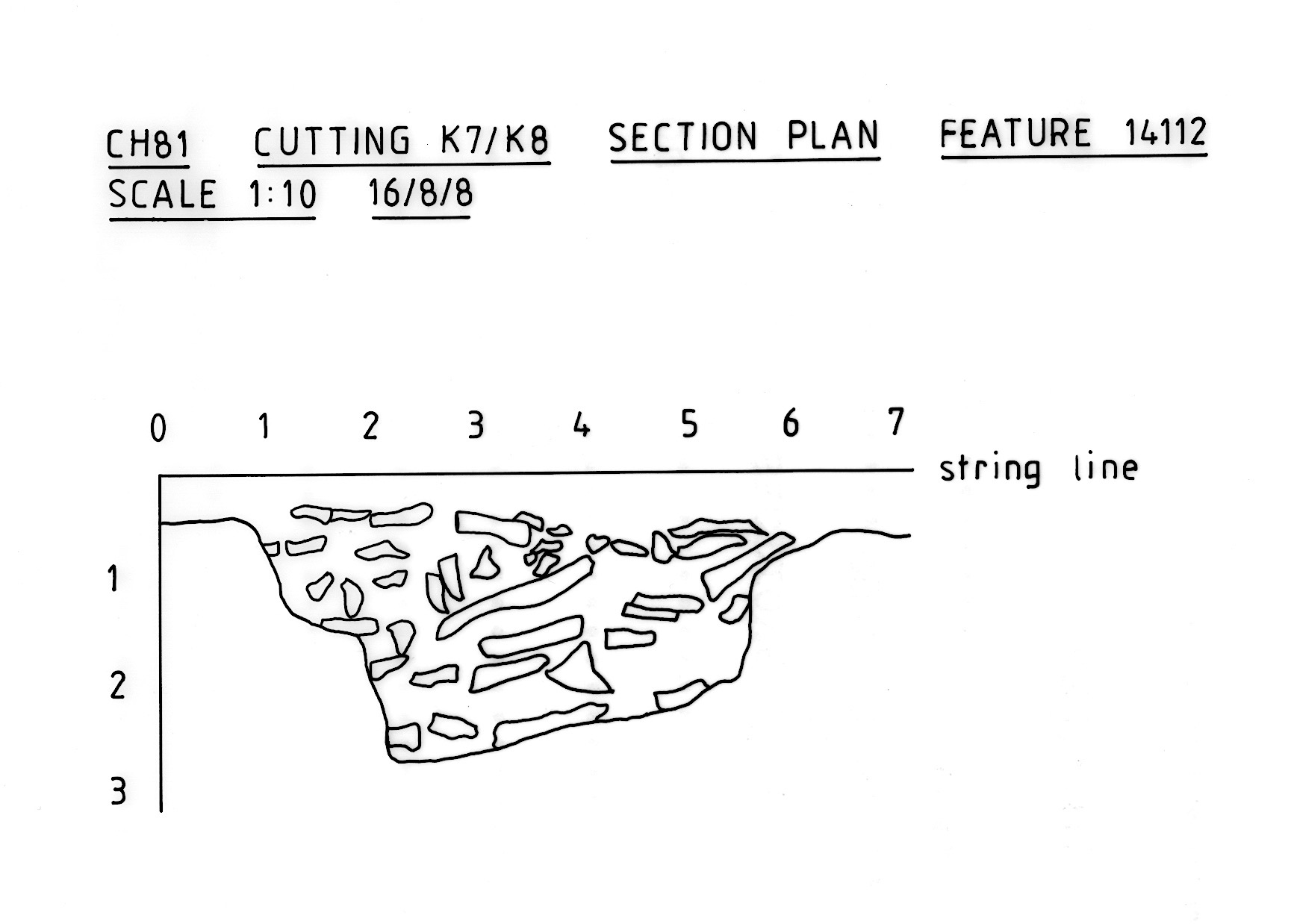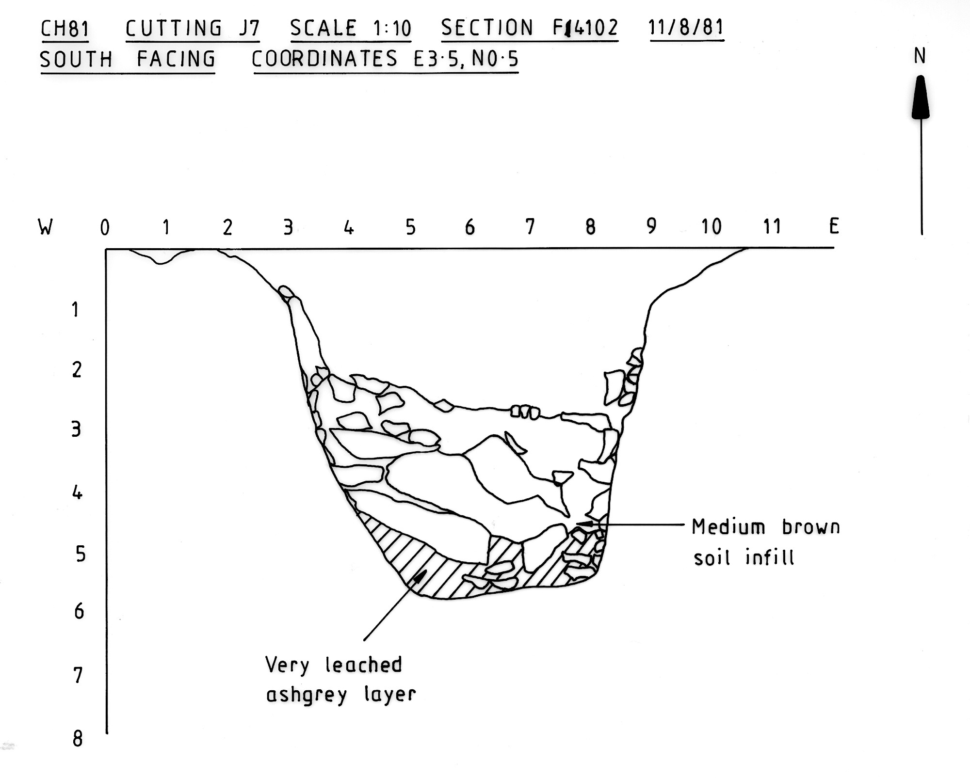 brown soil with small angular rubble. Some larger pieces evident. Many finds.