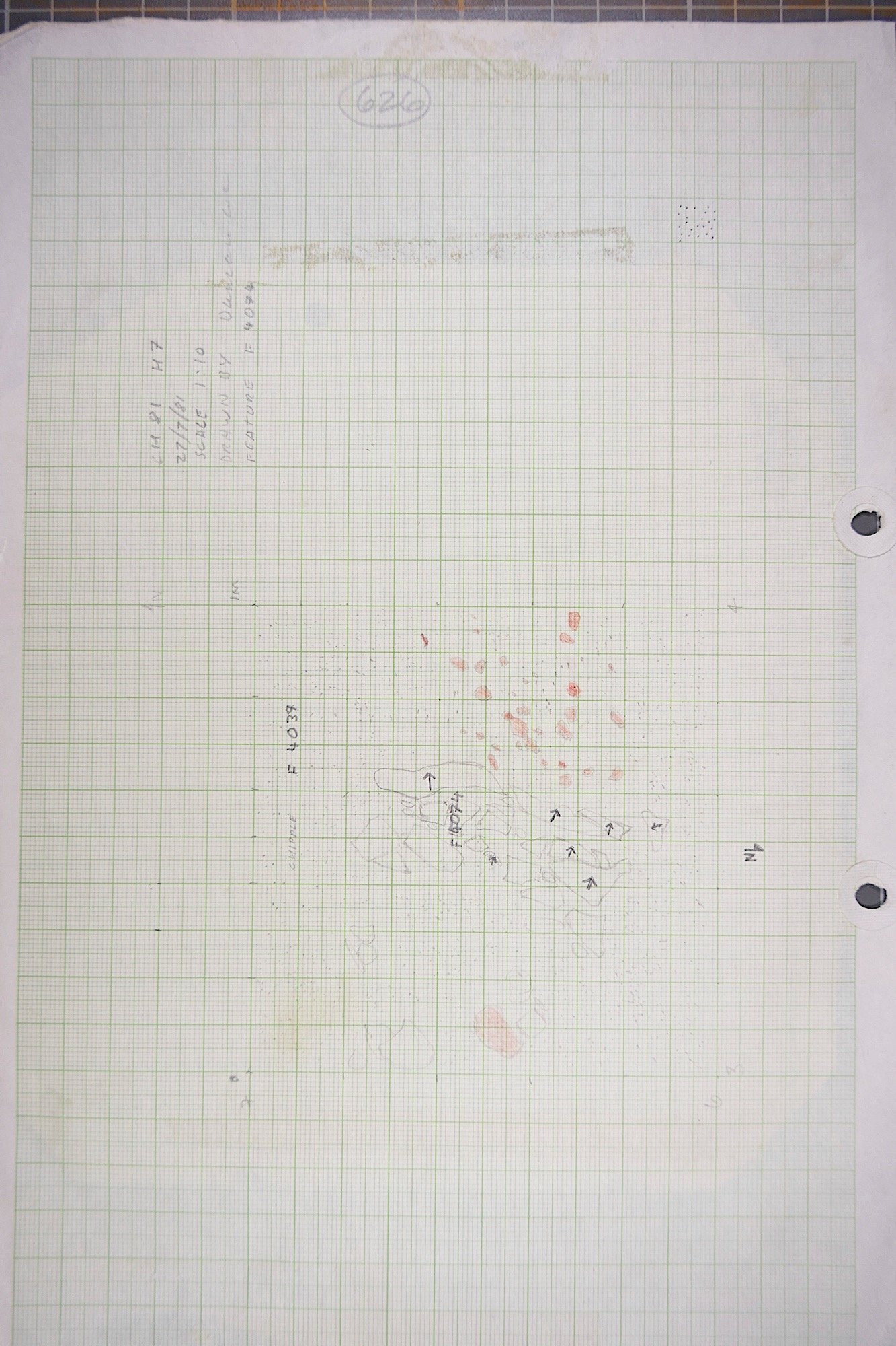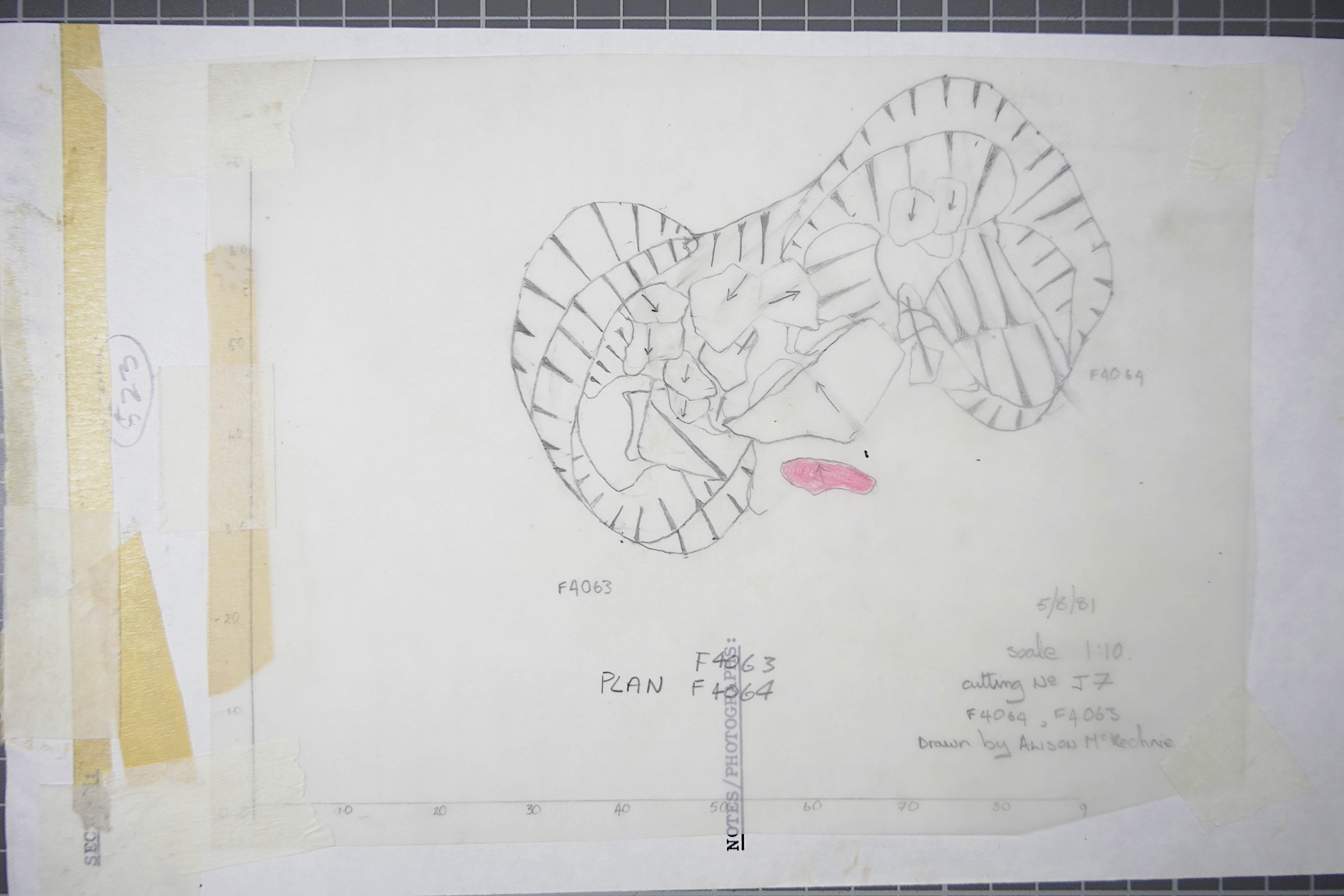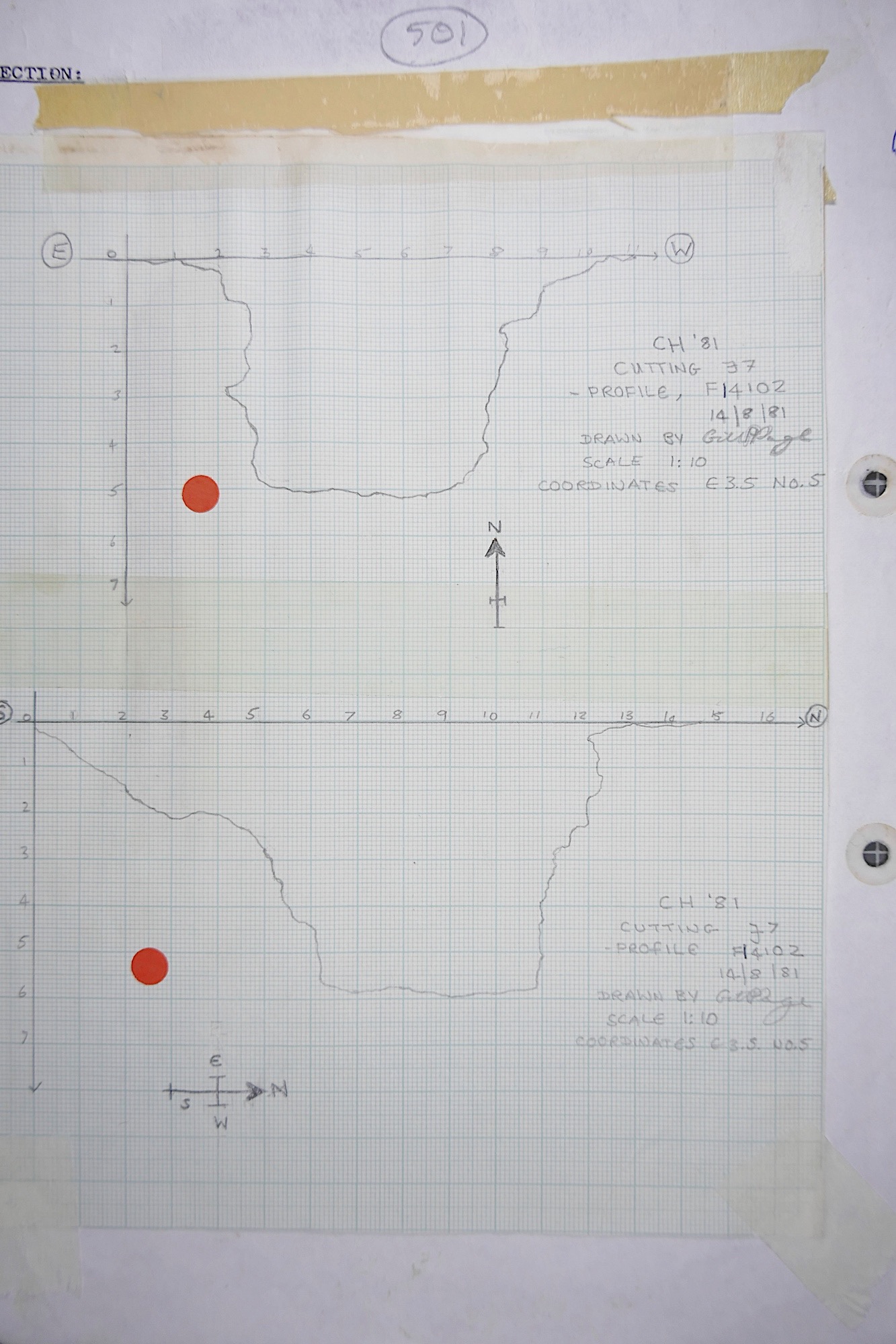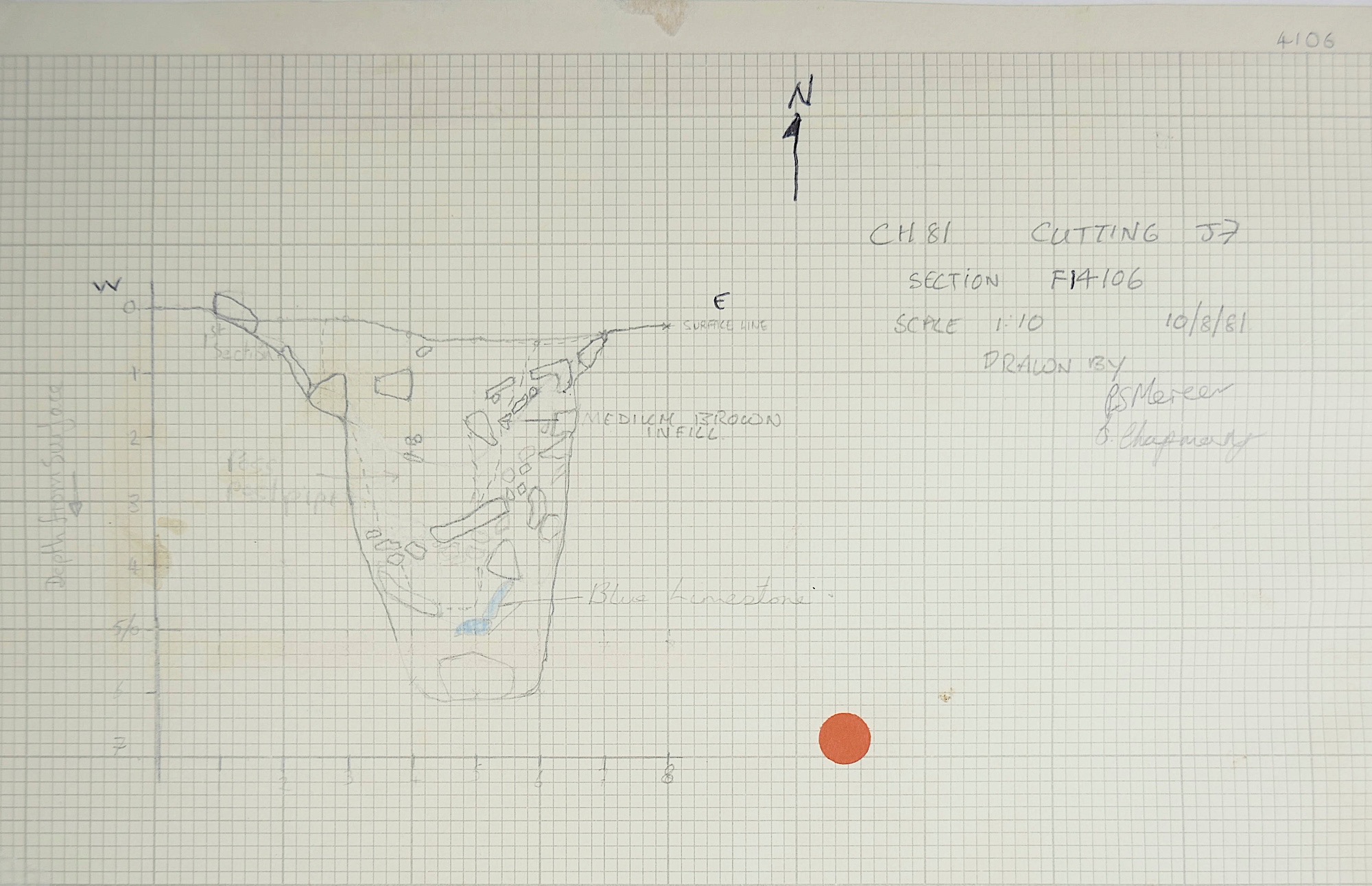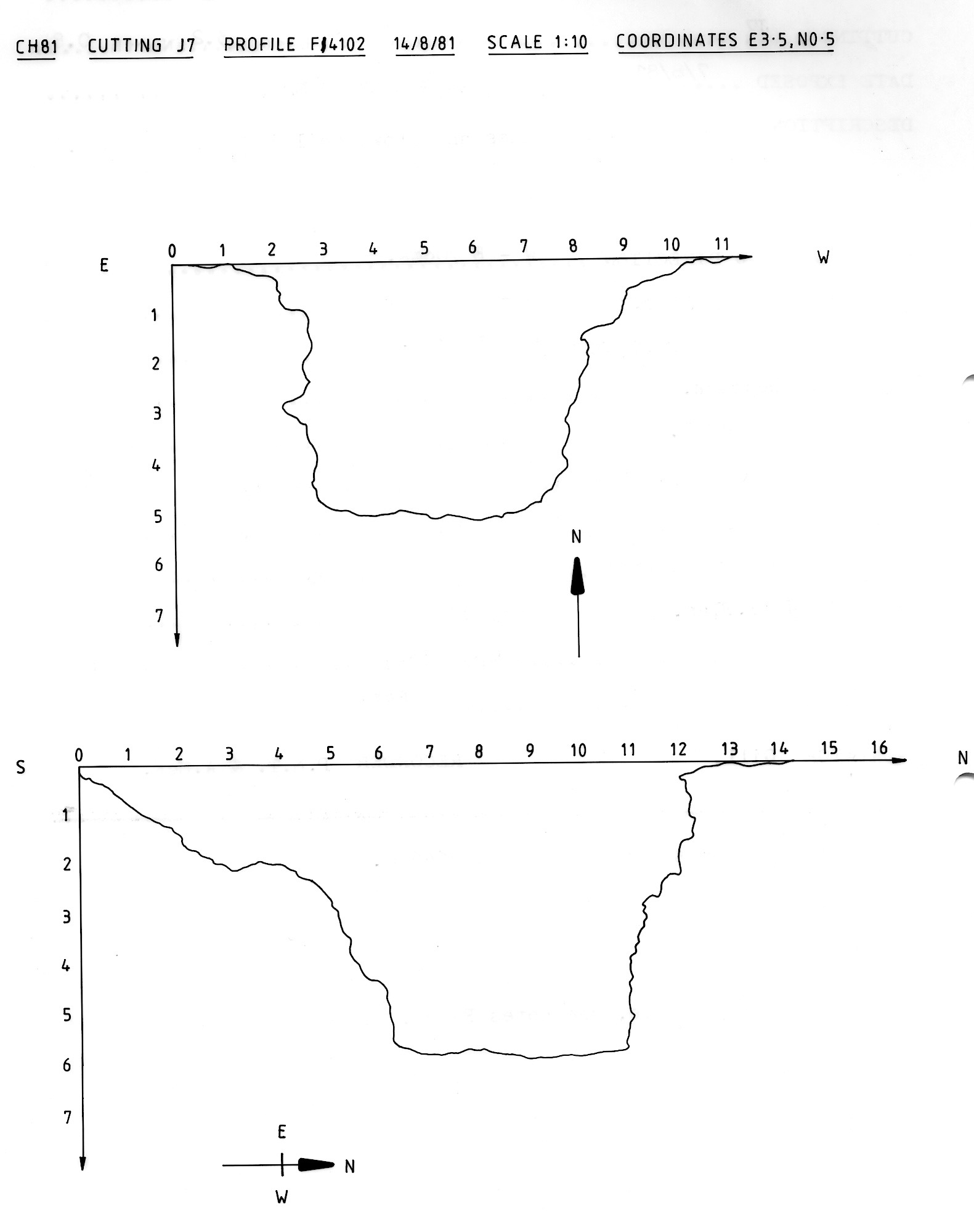 brown soil with small angular rubble. Some larger pieces evident. Many finds.