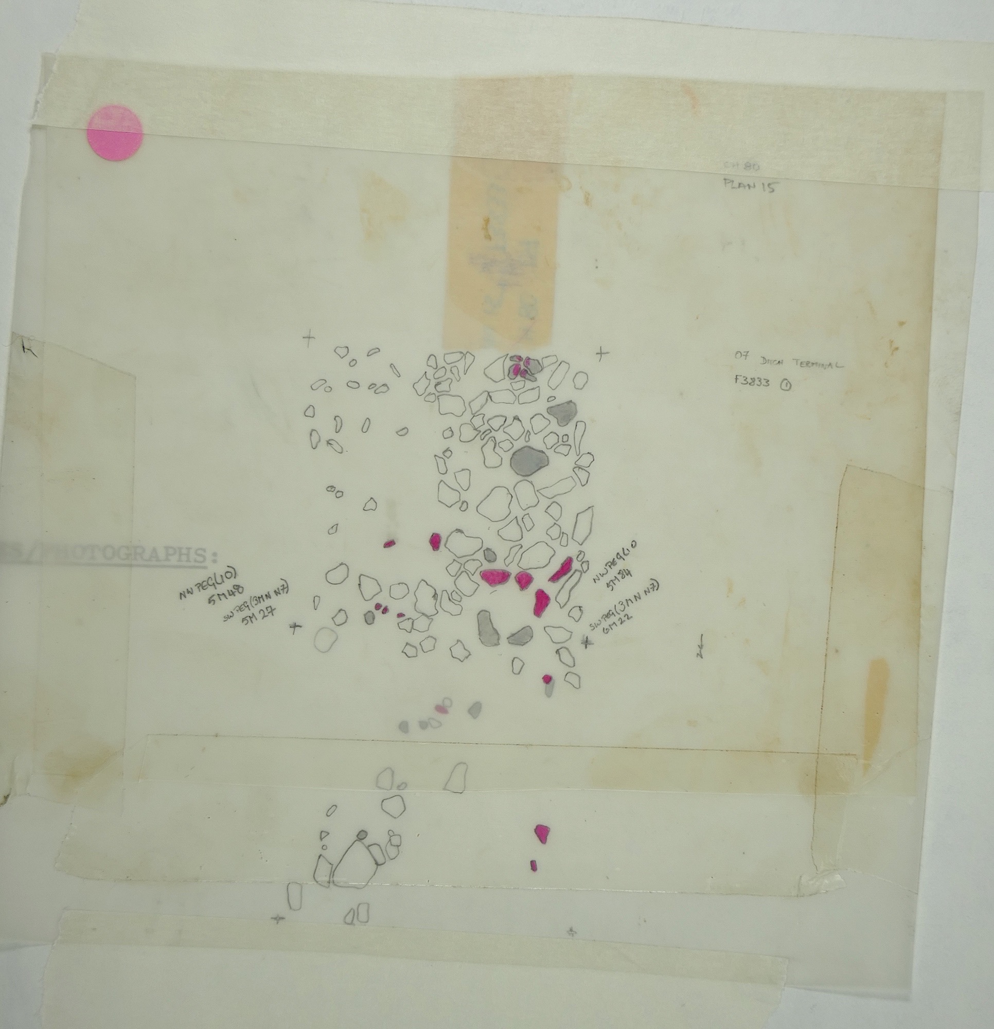 circular area of burnt stones, pitching slightly towards outer and loose