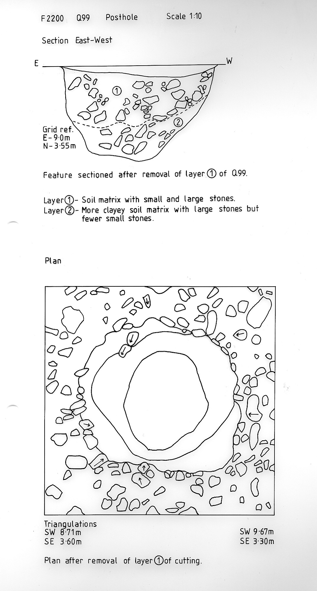 base cut into bedrock. Loose fill apparent after removal of layer (2) of