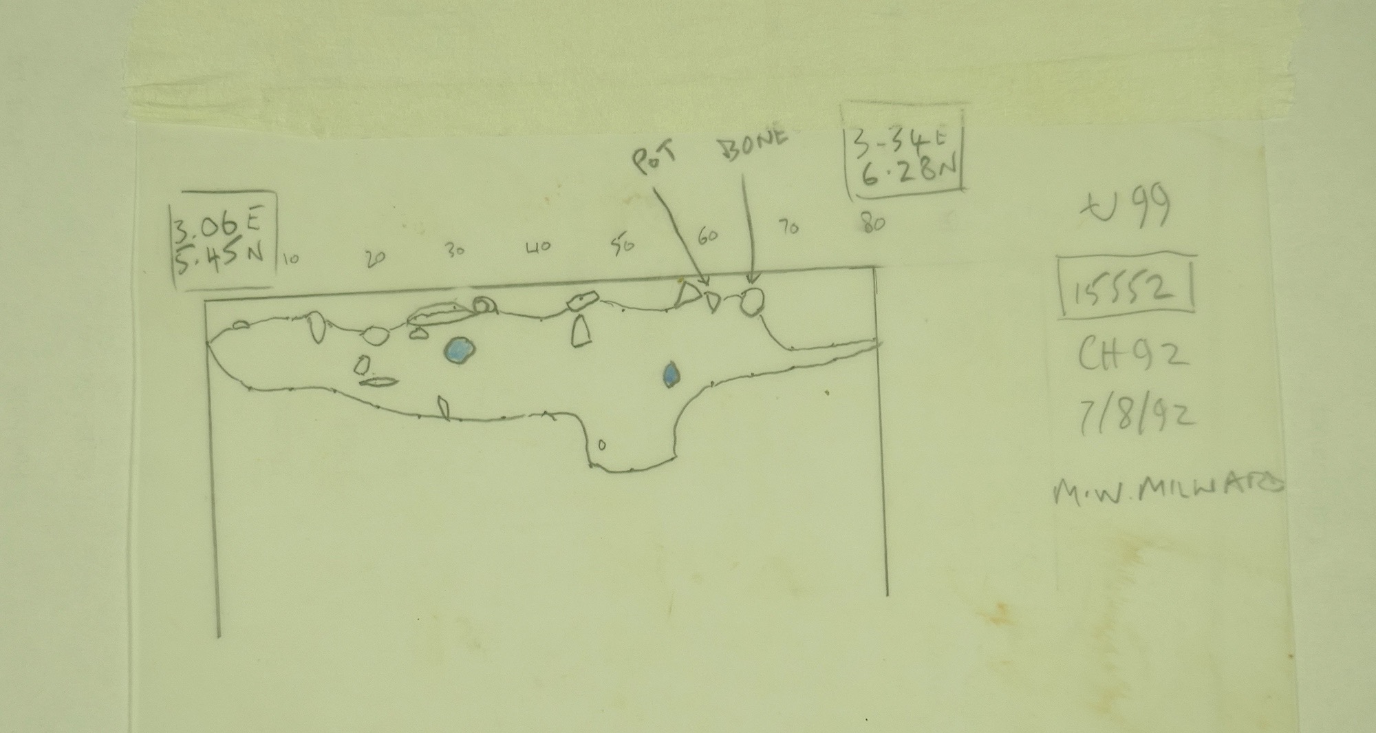 | F15552 | U99 | Group of pottery sherds in situ, lying in a reddish brown soil with occasional weathered medium stoens. No clear cut was visible on the horizontal removal of 2cm . On sectioning it became apparent that there is no cut but rather a deliberate deposition lying against upright/angled cemented semi-gull on the West and a rise in the gull to the East. The size of the bone and pottery indicated a deliberate placement of freshly/recently broken material. It is not a rubbish pit as there is far more stone placed here than rubbish, the stone having been brought in as the Bedrock here is gull. | 1 | 3 | F15560 | F15523 | 1 | 0 | 1 | 1 | http://www. | http://www. | http://www | http://www | http://www | ||||||||||||||||||||||||||||||||||||||||||||||||||||||||||||||||||||||||||||||||||||||||||||||||||||||||||||||||||||||||||||||||||||||||||||||||||||||||||||||||||||||||||||||||||||||||||||||||||||||||||||||||||||||||||||||||||||||||||||||||