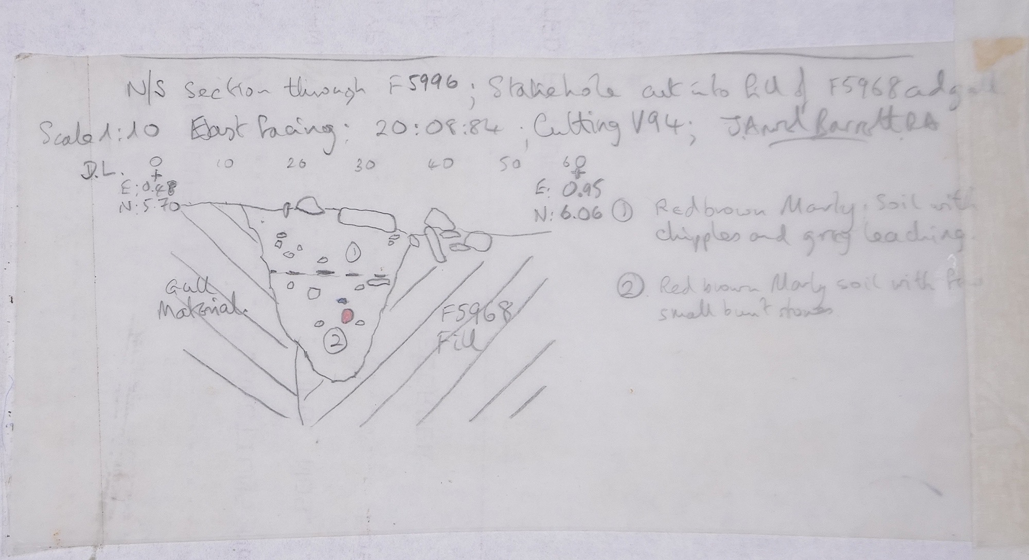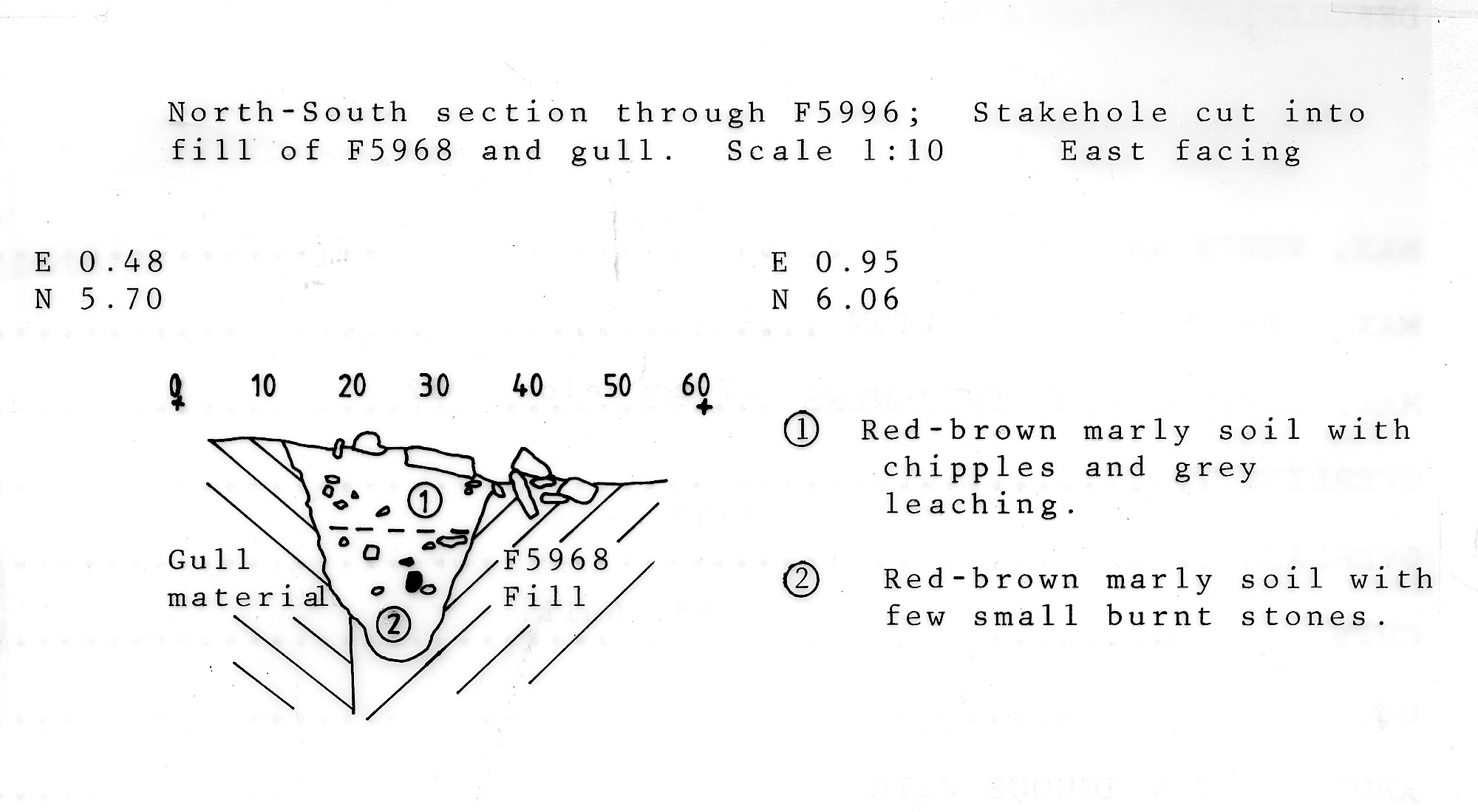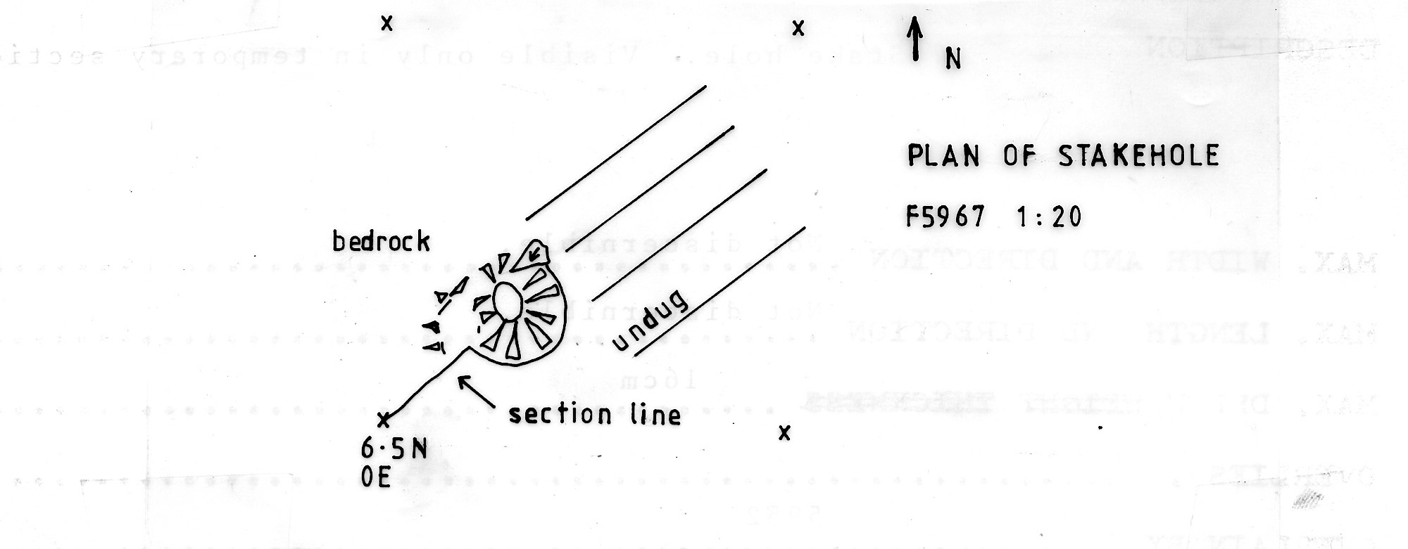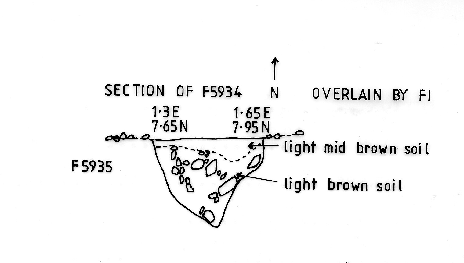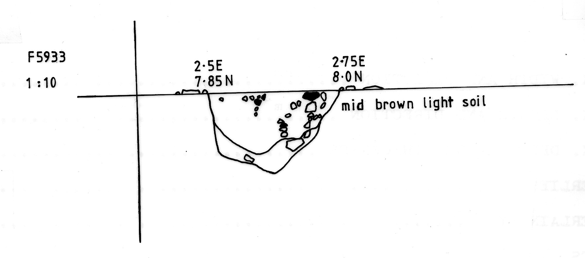 posthole with F05992. Localised group of medium-sized rocks in brown soil |